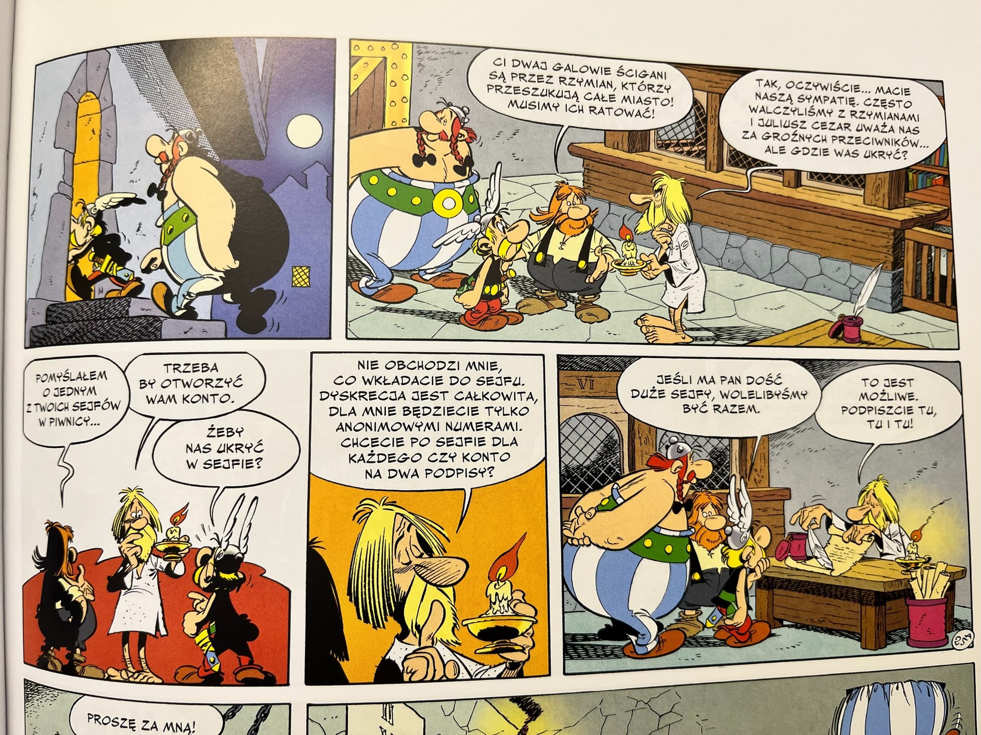 Kolejna cecha to bankowość. Szwajcaria słynie dziś ze stabilności systemu bankowego i stanowi bezpieczny azyl dla oszczędności deponentów z całego świata. W komiksie mamy sytuację, gdy bankier chcący uchronić Asteriksa i Obeliksa przed patrolem rzymskim kłamie, że doszło do włamania i kradzieży skarbów z jednej ze skrytek w jego banku. Po fakcie jest załamany tym, że zniszczył reputację prowadzonej przez siebie działalności.