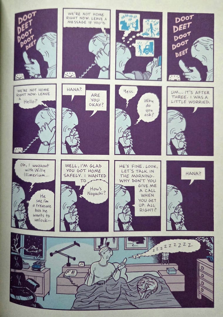 Hana jest niepewna siebie, ciepła, delikatna. Stanowi niemal całkowite przeciwieństwo chłodnego, geometrycznego, do bólu racjonalnego Asteriosa. Widzimy, jak ich orbity się przecinają, jak między nimi zaczyna iskrzyć uczucie, które wydaje się równie nieuchronne, co skazane na katastrofę. Opowieść meandruje między rodzącą się relacją, coraz głębszymi pęknięciami w małżeństwie a teraźniejszością, w której rozbity Asterios próbuje - być może po raz pierwszy w życiu - zbudować coś prawdziwego własnymi rękami. Nad wszystkim unosi się jeszcze duch Ignazia, zmarłego przy porodzie brata bliźniaka, który pełni od czasu do czasu rolę narratora. Spokojnego, zdystansowanego, chwilami wręcz bezlitosnego obserwatora, punktującego zza grobu błędy ocalałego brata.