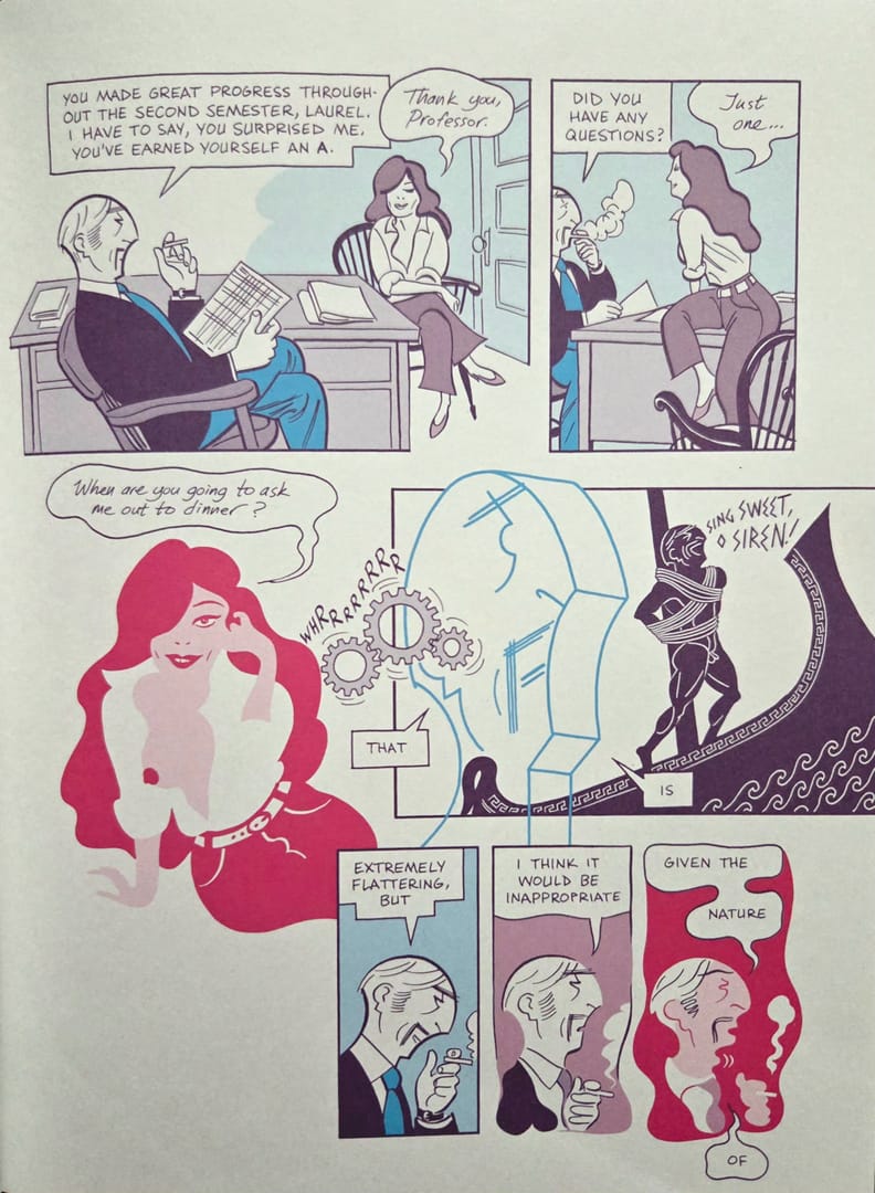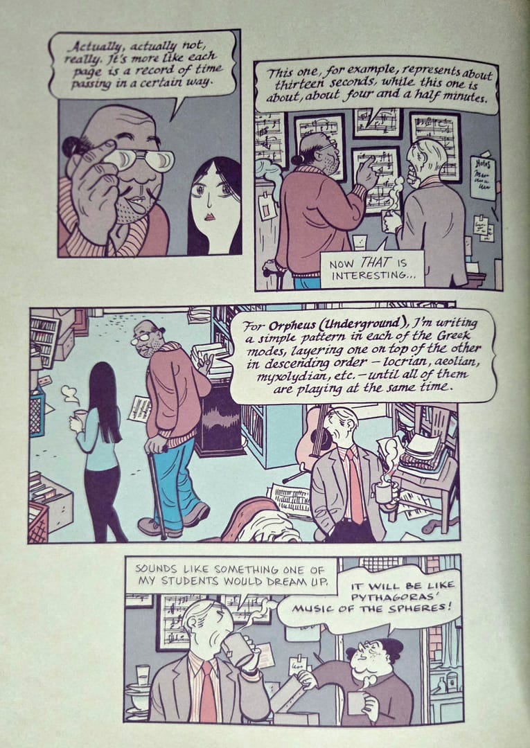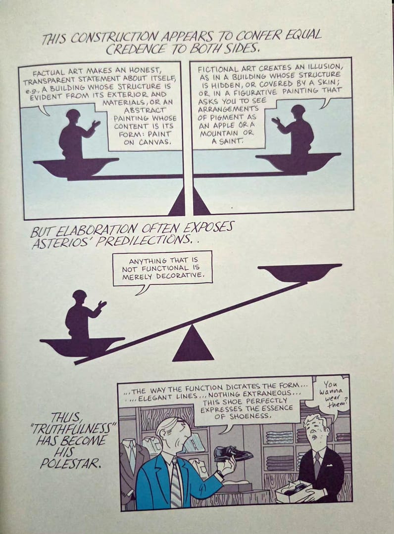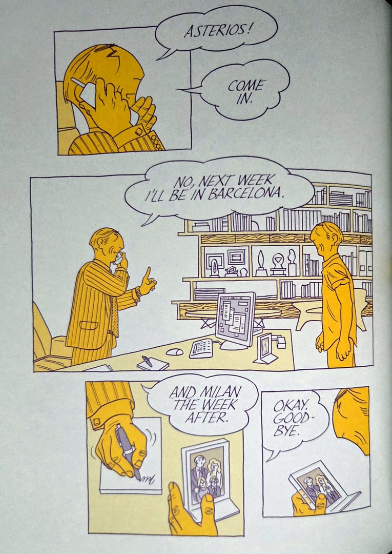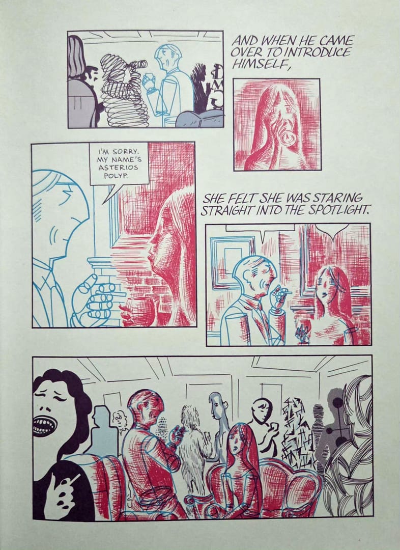 Mazzucchelli prowadzi tę historię dwutorowo. Z jednej strony obserwujemy teraźniejszość Asteriosa: jego pobyt w małym amerykańskim miasteczku, próbę urządzenia się od nowa, zderzenie z ludźmi, którzy nie są zachwyceni jego erudycją i nie mają najmniejszego zamiaru padać przed nim na kolana. Z drugiej - wracamy do przeszłości. Do dzieciństwa. Do akademickiej kariery. Do kolejnych warstw pychy, które Asterios nakładał na siebie przez lata jak świetnie skrojone garnitury. I przede wszystkim do związku z Haną - od pierwszego spotkania aż po rozpad.