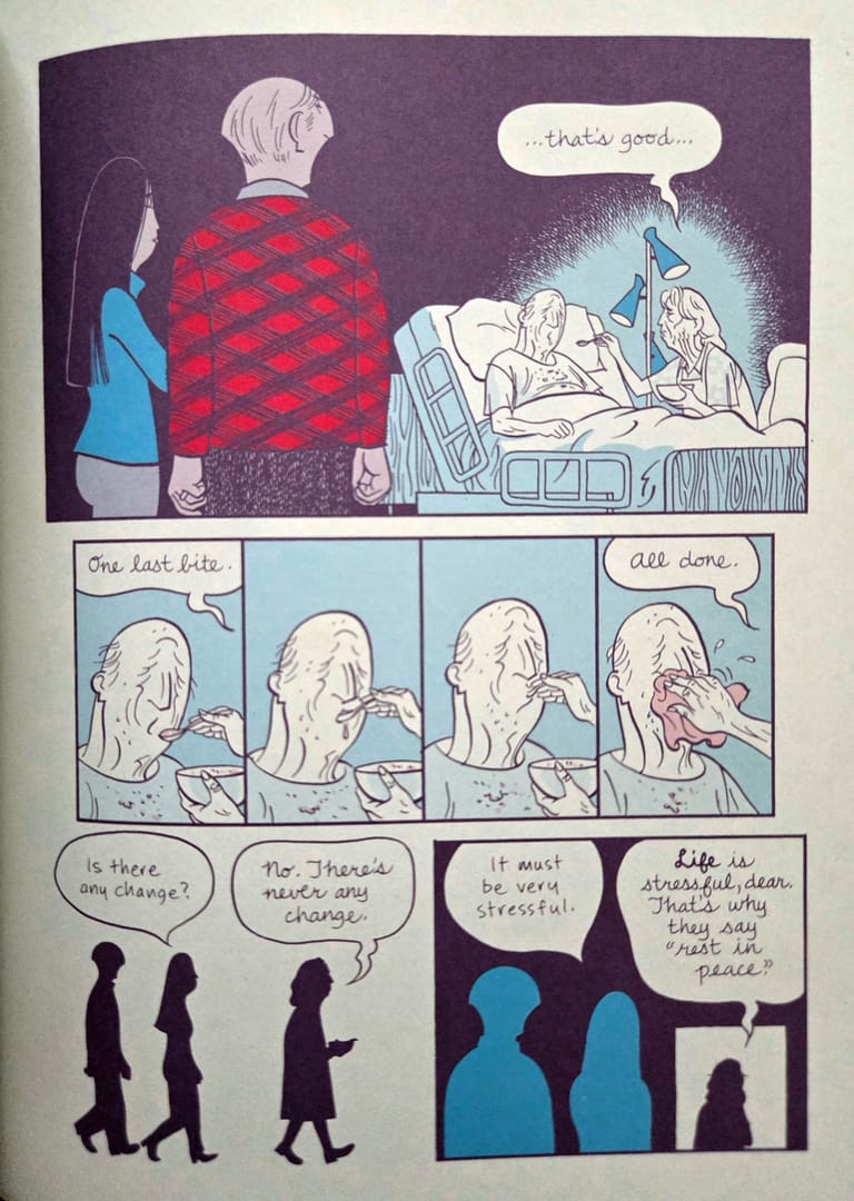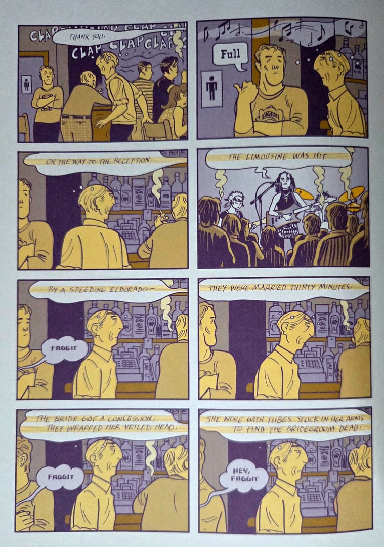Podobnie jak kreska, tak kolory odgrywają w tej opowieści bardzo ważne znaczenie. Autor użył mocno zawężonej palety barw, dzięki czemu odbiór emocjonalny podczas czytania jest znacznie głębszy. Granie kolorami, konfrontacja barw zimnych z ciepłymi, to wszystko sprawia, że ten komiks żyje w czytelniku. I powiem Wam, że świat zamknięty w cyjanie, magencie i żółci potrafi być zdecydowanie piękniejszy, a przede wszystkim prawdziwszy, niż obraz tonący w pełnej palecie kolorów.