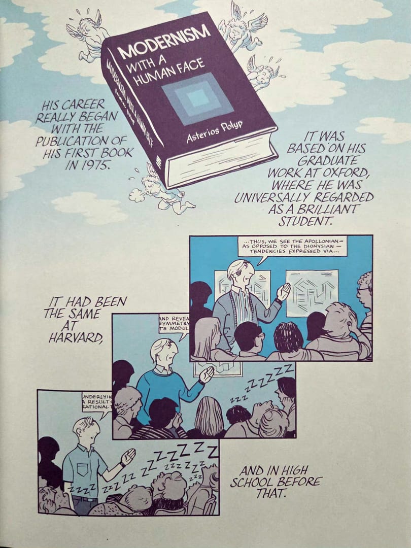 Poznajcie Asteriosa Polypa – architekta, który skończył pięćdziesiąt lat. Człowieka uznanego, błyskotliwego i całkowicie zakochanego we własnym sposobie myślenia. Projektuje budynki, których nikt nigdy nie zbudował i pewnie nie zbuduje, bo są zbyt teoretyczne, zbyt czyste, zbyt doskonałe w swojej matematycznej konstrukcji, a przez to po prostu nieludzkie. Asterios nie patrzy na świat jak większość ludzi. Analizuje, dzieli, szufladkuje, porządkuje. Widzi rzeczywistość w binarnych opozycjach. Zero-jedynkowo. Albo coś jest funkcjonalne, albo stanowi zbędną dekorację.