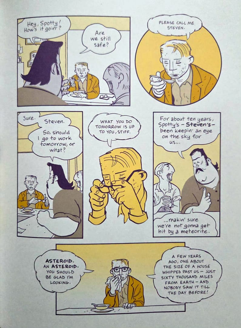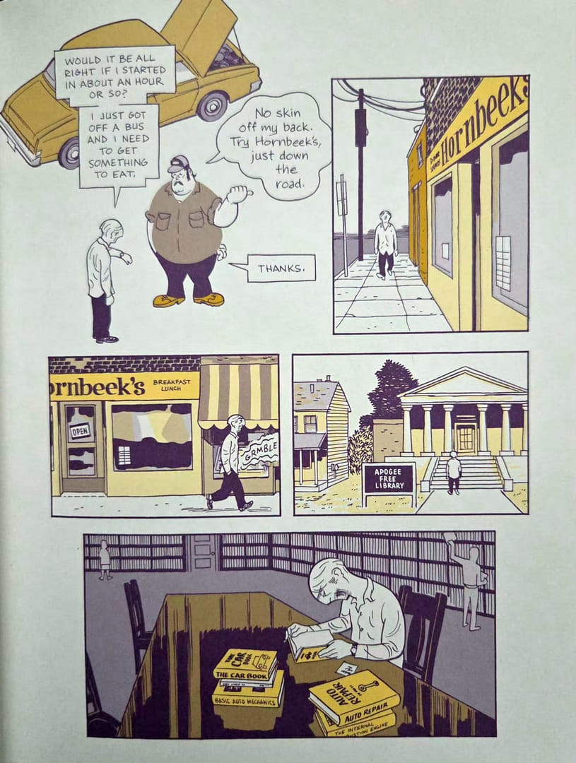 Można by się spodziewać, że człowiek jego formatu szybko stanie na nogi dzięki znajomościom, dawnym współpracownikom, kontaktom z uczelni i środowiska. Tylko że Asterios robi coś zupełnie innego. Postanawia zacząć od zera. Naprawdę od zera. Wsiada do pierwszego lepszego autobusu i jedzie jak najdalej. Najlepiej tam, gdzie nikt nie słyszał o dekonstruktywizmie, teorii formy i wielkiej sztuce.