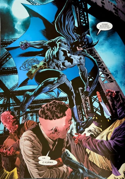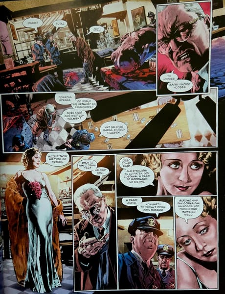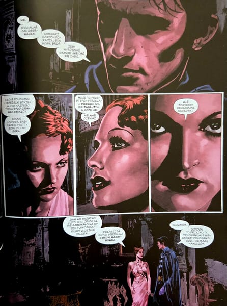 Oczywiście „Pierwszy rycerz” nie jest wolny od wad. Bywa momentami zbyt płytki, odrobinę zbyt zapatrzony w nostalgię i nie zawsze w pełni wykorzystuje potencjał głównego antagonisty. Najciekawszym przeciwnikiem Batmana okazuje się tu tak naprawdę nie konkretna postać, lecz cała epoka: strach, przemoc, polityczna paranoja, antysemityzm, społeczna frustracja i przekonanie, że siła rozwiązuje wszystko szybciej niż prawo. Gdy komiks pracuje właśnie na tym poziomie, potrafi być naprawdę mocny. Gdy musi wrócić do mechaniki fabuły i domykania kryminalno-horrorowej intrygi, robi się bardziej przewidywalny.