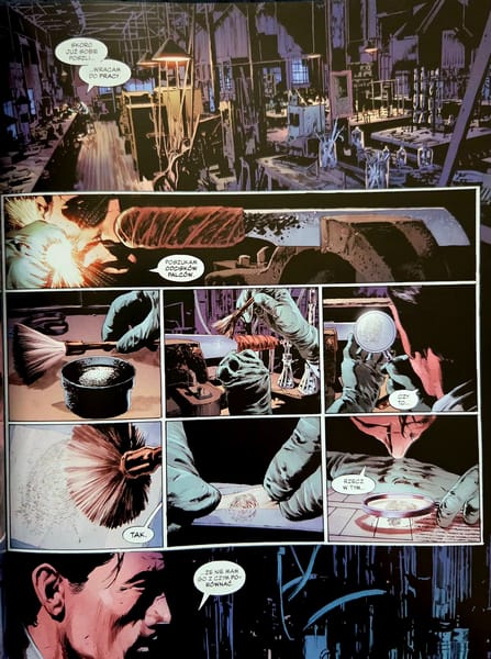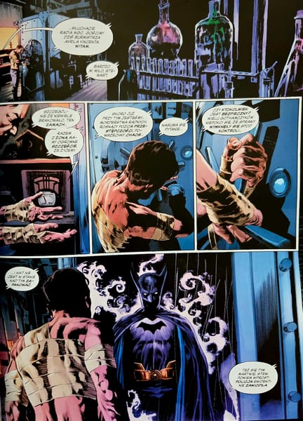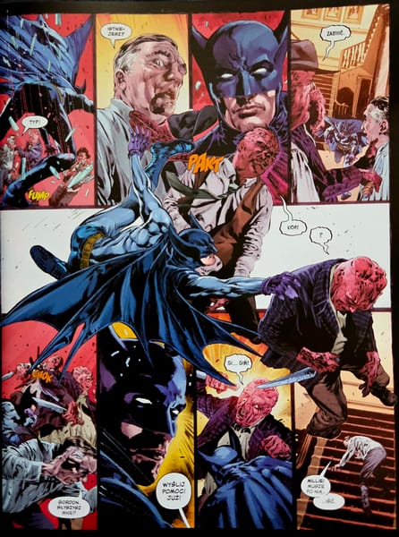 Kolory Mike’a Spicera znakomicie domykają warstwę graficzną. Gotham jest tu mroczne, przytłumione, miejscami wręcz duszne. A jednak w tym brudnym, przygaszonym świecie kolorysta nie boi się mocniejszych kontrastów, które dodają planszom charakteru i dramaturgicznego napięcia. Światło nie rozprasza mroku, tylko wydobywa z niego kolejne pęknięcia. Dzięki temu komiks ma własną temperaturę: chłodną, wilgotną, nieprzyjemną, ale dziwnie pociągającą.