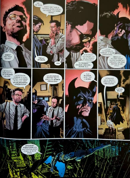 Jeśli jednak szukacie komiksu, który wywróci mitologię Mrocznego Rycerza do góry nogami i powie coś absolutnie odkrywczego o naturze władzy, przemocy czy traumy, możecie poczuć niedosyt. To nie jest „Powrót Mrocznego Rycerza” ani „Rok Pierwszy”. To sprawny, wizualnie oszałamiający album, który ma swój ciężar, ale miejscami ugina się pod własnymi ambicjami. Zakończenie domyka historię mocnym akcentem, lecz zostawia nas z pytaniem: czy w świecie Batmana można jeszcze opowiedzieć historię, która nie będzie tylko echem przeszłości? „Pierwszy rycerz” próbuje, chwilami naprawdę pięknie, ale ostatecznie pokazuje też, że ucieczka od własnego mitu bywa trudniejsza niż pokonanie armii potworów.