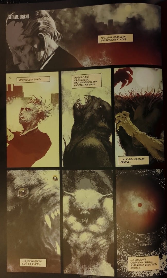 W pewnym momencie Batman staje z potworem twarzą w twarz - i zostaje podczas walki ugryziony. Od tej chwili stawka rośnie dramatycznie. Mroczny Rycerz nie tylko ściga wilkołaka, ale sam zaczyna zmagać się z postępującą likantropią. Granica między łowcą a ofiarą zaczyna się niebezpiecznie zacierać. Jak ta opowieść się zakończy, najlepiej przekonać się samemu.