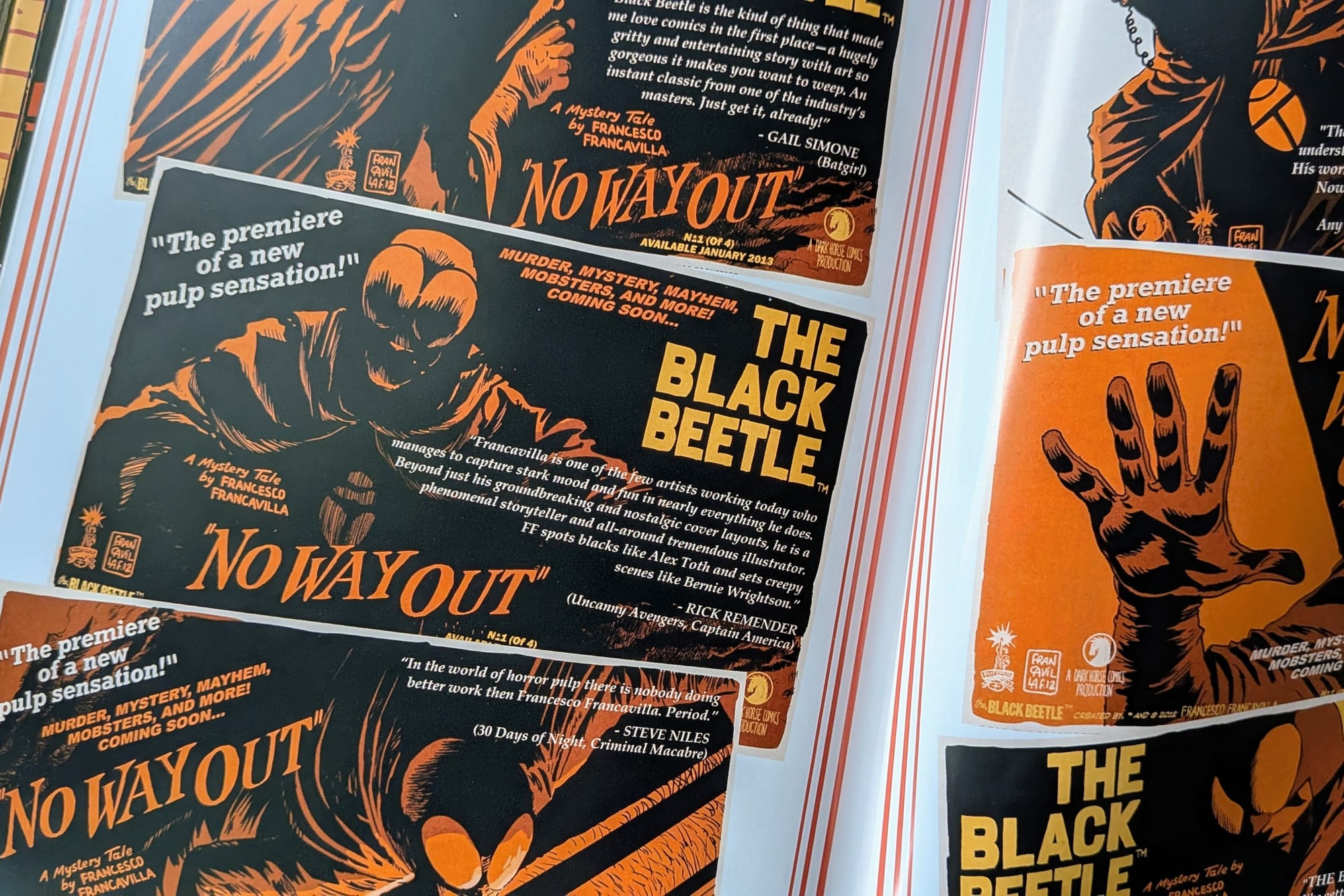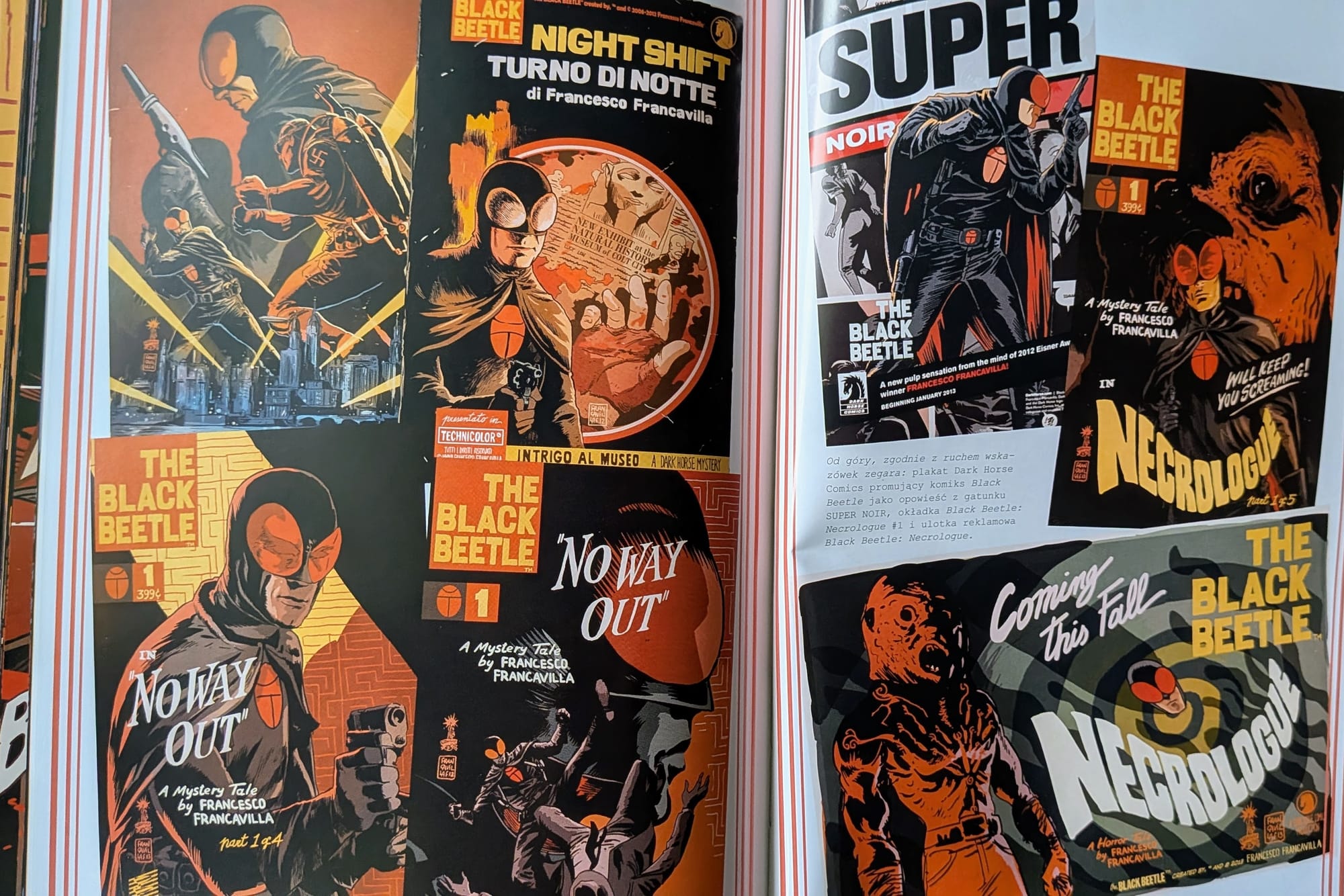 Najciekawsze jest to, jak świadomie Francesco Francavilla budował tę serię jako hołd dla dawnej pulpy. Sam mówił, że rozwijał postać przez lata, zanim trafiła do Dark Horse. Black Beetle dojrzewał w krótkich historiach internetowych i ashcanach (niskonakładowych minikomisach wydawanych przed oficjalną publikacją, często w celach kolekcjonerskich), a Francavilla krok po kroku tworzył wokół niego całe Colt City – fikcyjne miasto, które jest tu równie ważne co sam bohater. Twórca mówiąc o inspiracjach wprost wskazywał na pulpowe i noir filmy z lat 30.–50., na pisarzy pokroju Dashiella Hammetta i Raymonda Chandlera.