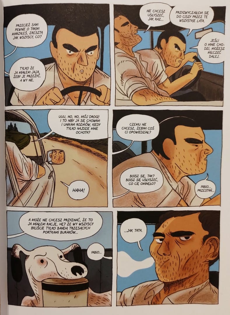 To konkretny kontekst: emigracja z południa Włoch do Francji była masowym zjawiskiem, które na lata zdefiniowało tożsamość wielu rodzin. Alfred przekłada te procesy na intymne skutki: pęknięcia w relacjach, żal i polityczne urazy, które bohaterowie przepracowują indywidualnie. W ten sposób historia polityczna staje się tłem kształtującym prywatne tragedie. Alfred nie tworzy klasycznego komiksu historycznego – przeszłość jest tu jak echo, stale obecna, choć nienazwana. Bohaterowie są potomkami tej historii albo uczestnikami jej końca. To również odwołanie do życiorysu autora, który sam pochodzi z mieszanej francusko-włoskiej rodziny i odczuł na sobie echa wojny. Wykorzystane elementy autobiograficzne nadają tekstowi autentyczne brzmienie.