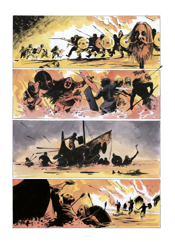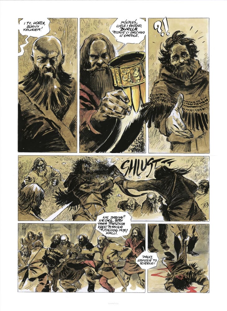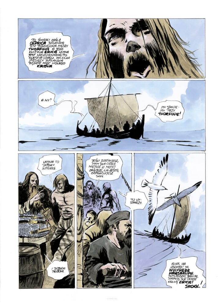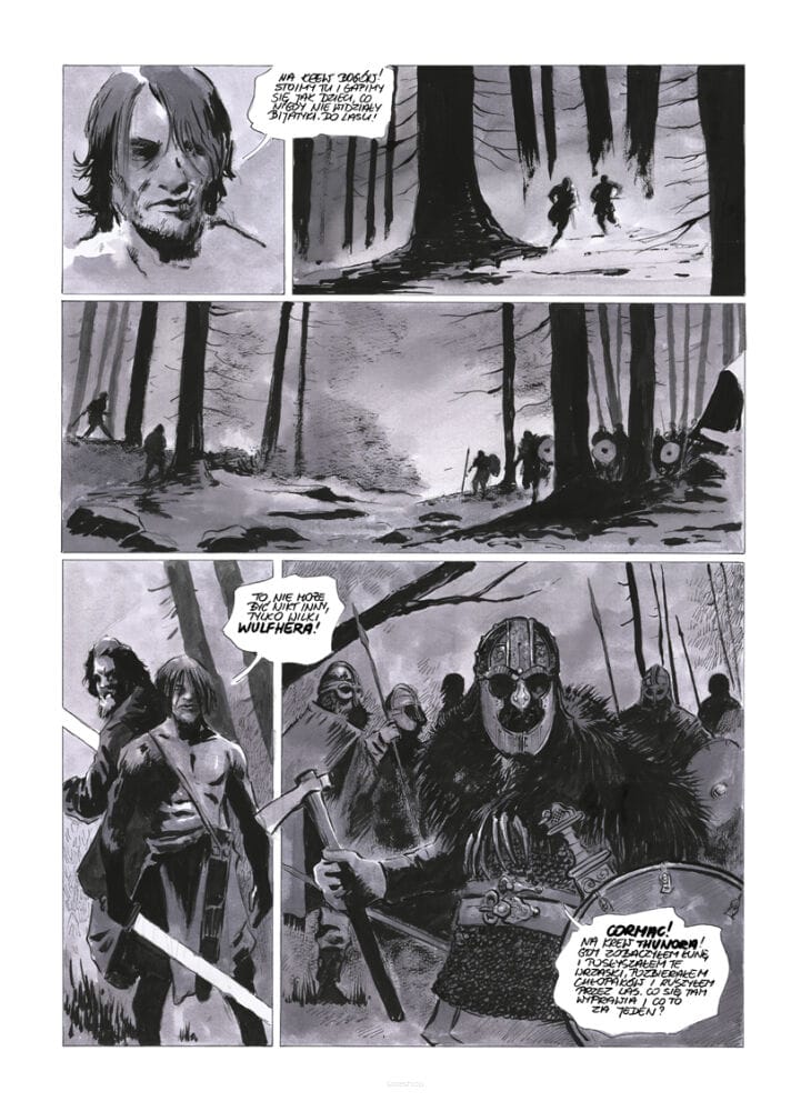 Fabuła osadzona jest na przełomie VI i VII wieku n.e., w czasach najazdów Jutów, Anglów i Saksonów na Brytanię. Bohaterami są dwaj morscy łupieżcy – jutlandzki wojownik Wulfhere Harsaklifn i jego prawa ręka, Celt z Erin Cormac Mac Art, zwany Wilkiem. Niegdyś dowódca irlandzkich Rewerów, teraz skazaniec ocalony przez mroczną Morrigan. Howard w oryginale nazywał swoich bohaterów wikingami, ale Biernacki skorygował chronologię – akcja komiksu rozgrywa się kilka wieków przed epoką wikingów.