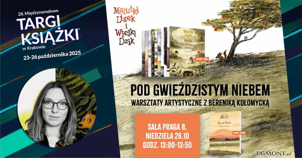 W niedzielę od godziny 10:00 – 12:00 na stoisku będzie można spotkać Berenikę Kołomycką – autorkę serii „Malutki Lisek i Wielki Dzik” oraz zupełnie nowego cyklu „Kocina”. Po sesji autografów i wrysów odbędą się warsztaty artystyczne z autorką.
