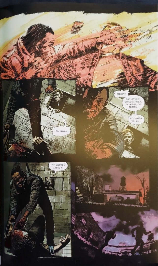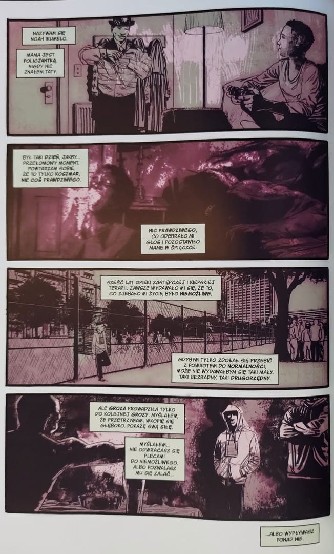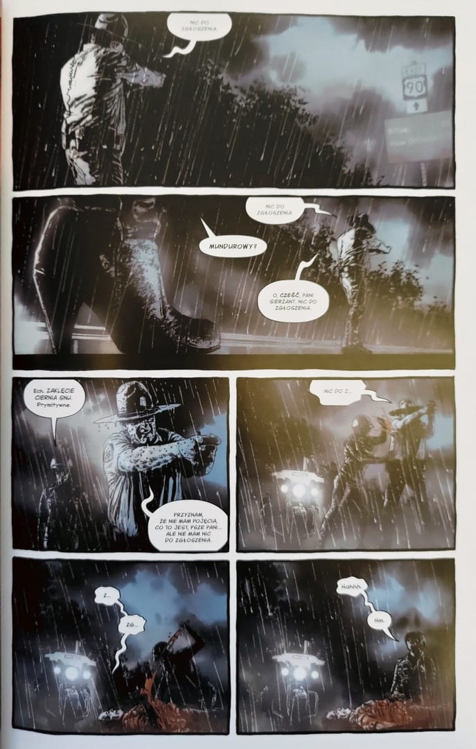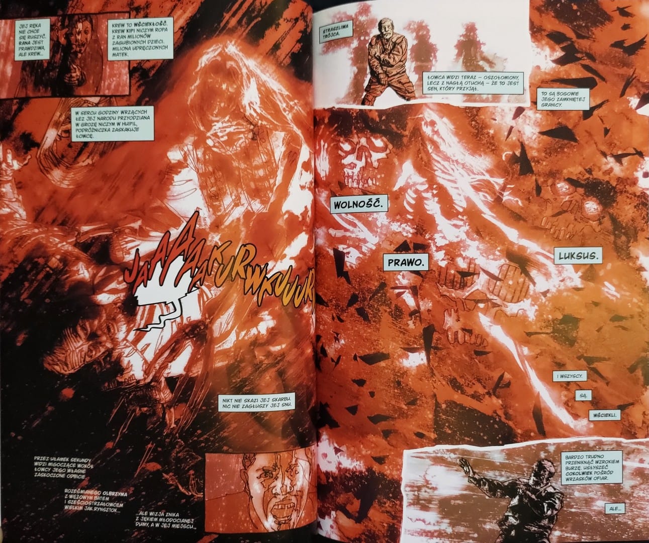 Planowanie plansz zasługuje na osobną pochwałę. Twórcy regularnie łamią klasyczną siatkę kadrów, ale robią to z wyczuciem. Są strony, które niemal krzyczą do czytelnika, i takie, które tylko szepczą, zmuszając do uważniejszego spojrzenia. To komiks, który nagradza czytelnika za cierpliwość i uwagę, zachęcając do dokładnej analizy wszystkich detali, które znajdują się w tle.