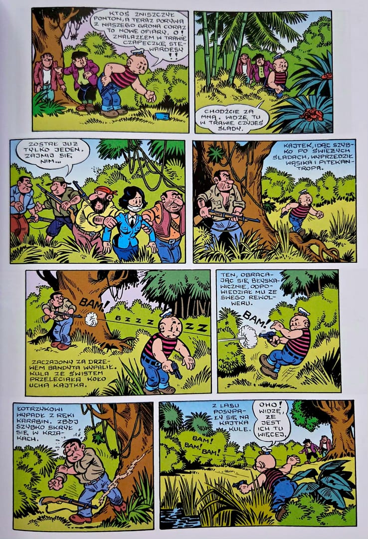 Zacznijmy od tego, o czym w ogóle jest ta radosna karuzela absurdu. Akcja startuje z grubej rury, bez zbędnych ceregieli. Profesor Kosmosik odkrywa zagubiony pamiętnik kapitana Cooke’a, w którym jest mowa o tajemniczej wyspie na Pacyfiku, zamieszkanej przez małpoluda. W tym samym czasie nasi dwaj rezolutni marynarze, Kajtek i Koko, członkowie załogi poczciwego, choć mocno zdezelowanego parowca „Kakaryka”, zaliczają mrożący krew w żyłach sztorm, w którym ledwo ratują własne życia. Potem lądują w słonecznym Neapolu, gdzie ich drogi nieustannie przecinają się z tajemniczym Wąsikiem. Tu już zaczyna się zabawa na całego. Festiwal gagów i pomyłek. Zabawa w chowanego z włoską policją. I w końcu list od profesora Kosmosika, który prosi o wyjaśnienie zagadki Pitekantropa. Akcja rusza pełną parą i zamiast do Warszawy przenosi naszych bohaterów na daleką, tajemniczą wyspę. Oczywiście nie chcę popsuć Wam zabawy z odkrywaniem całej historii. Polecam sięgnąć po omawiany komiks i samemu stać się świadkiem tych jakże zabawnych, a momentami groźnych wydarzeń w towarzystwie Kajtka i Koka.