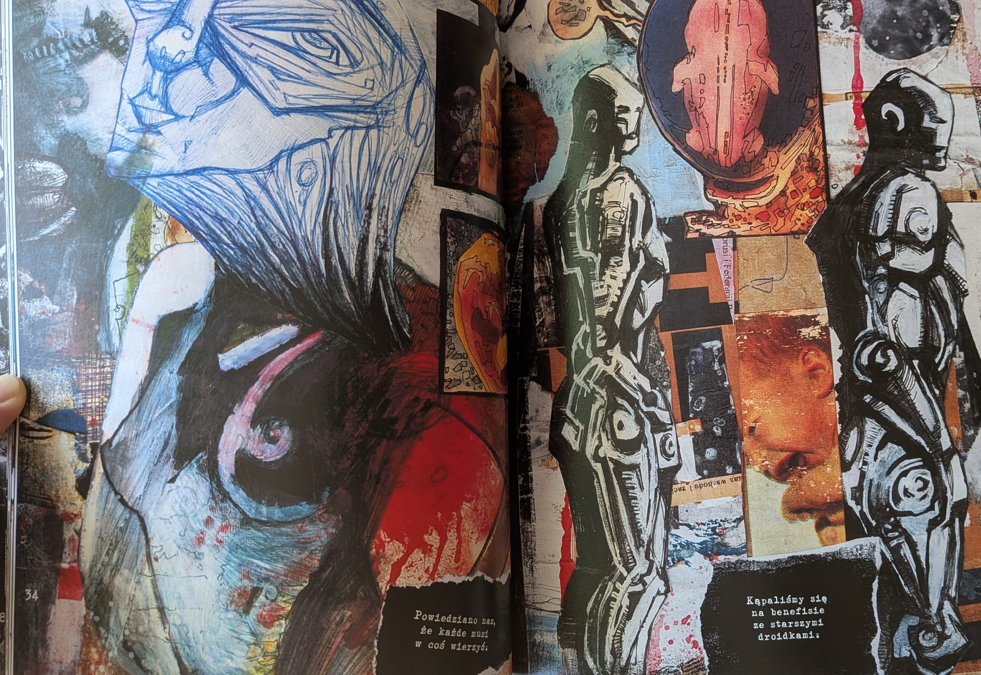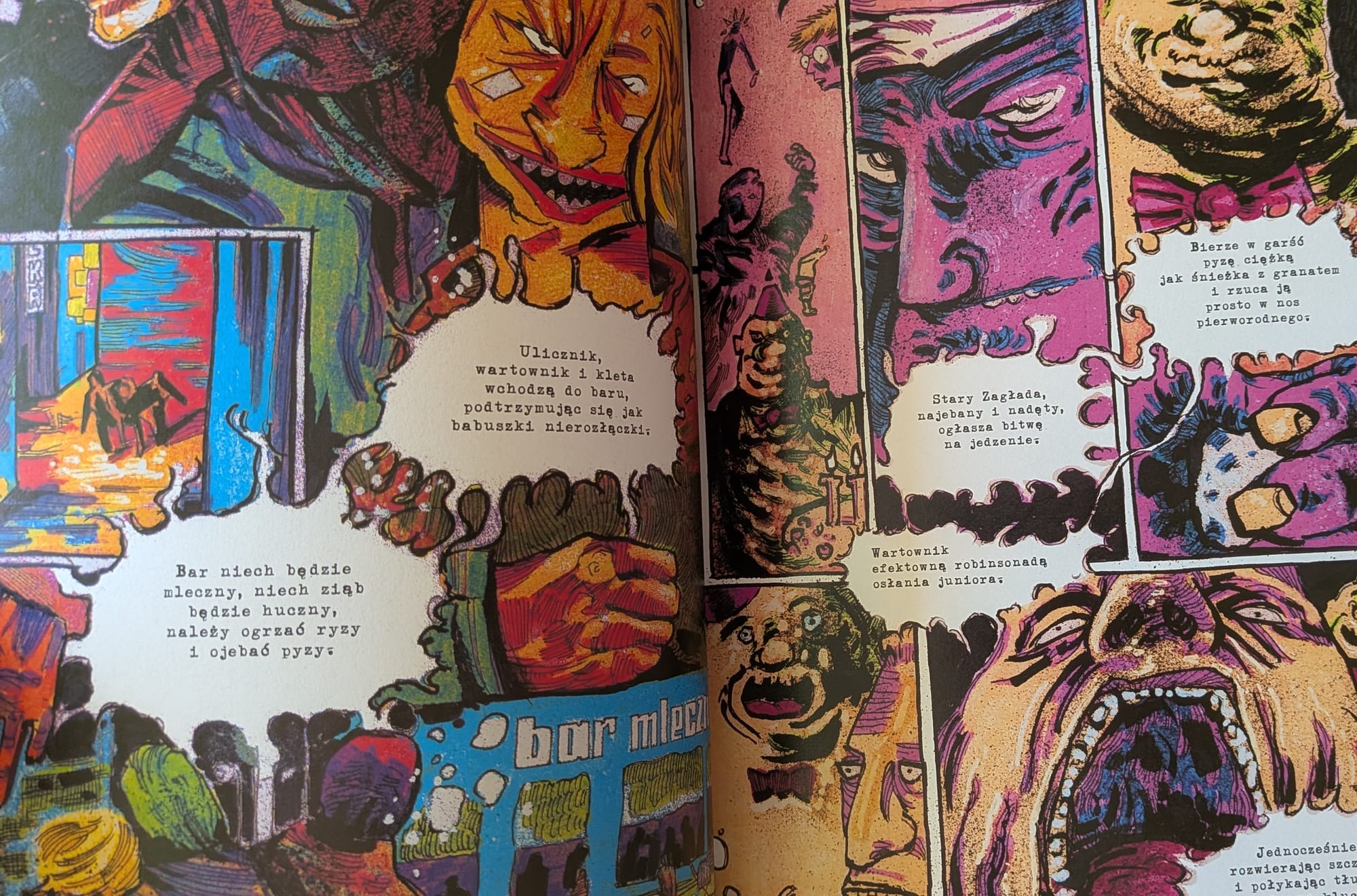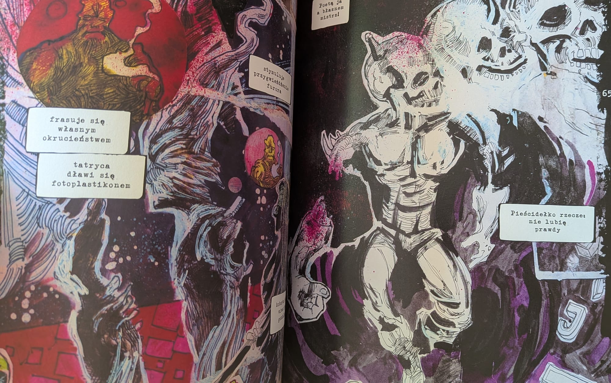 Z tekstem mam już większy problem – i mówię to zupełnie uczciwie. Widać, że mamy tu do czynienia z poezją, często bardzo swobodną, momentami surrealistyczną, operującą absurdalnymi skojarzeniami i rozbijaniem języka. To nie są dialogi prowadzące akcję, raczej krótkie, często zagadkowe frazy. Być może dla czytelników obeznanych z poezją eksperymentalną będzie to naturalne środowisko. Ja jednak przyznaję otwarcie, że na poezji znam się słabo, dlatego trudno mi ją tu oceniać albo interpretować.
