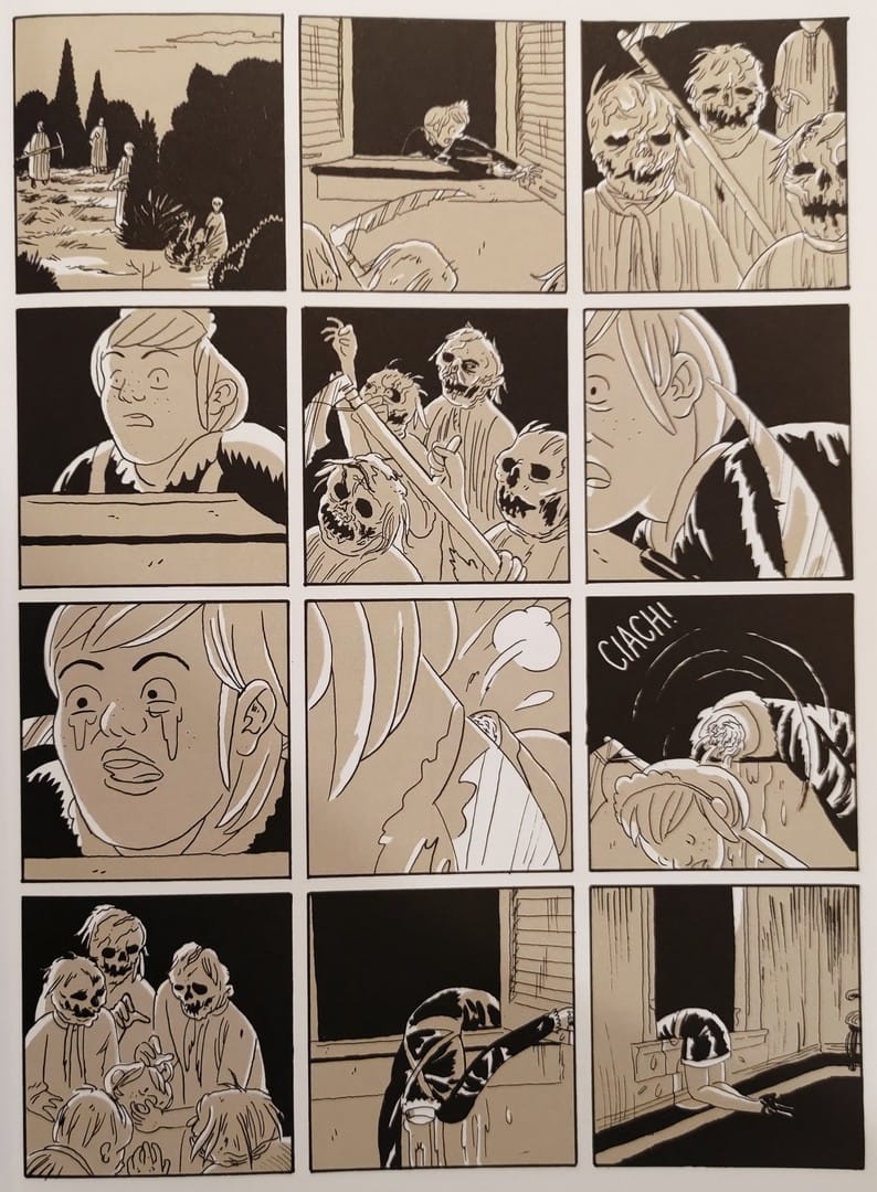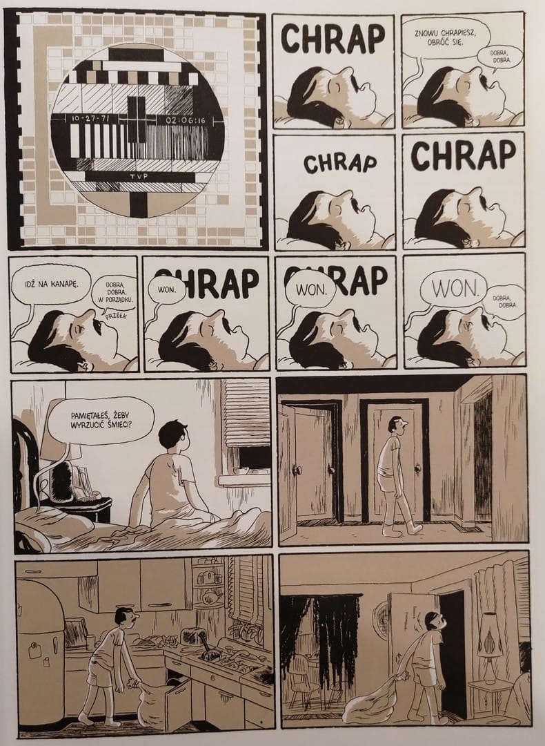 W „Krwi dziewicy” większość plansz utrzymana jest w ciepłych, brązowo-beżowych tonach – kadry sprawiają wrażenie, jakbyś patrzył na codzienność przez lekko przybrudzoną szybę. Dzięki temu zwykłe sceny domowe, stół pełen papierów czy pokój z dzieckiem, nie wyglądają jak ilustracje, tylko jak prawdziwe fragmenty życia, z zapachem zmęczenia i rutyny.