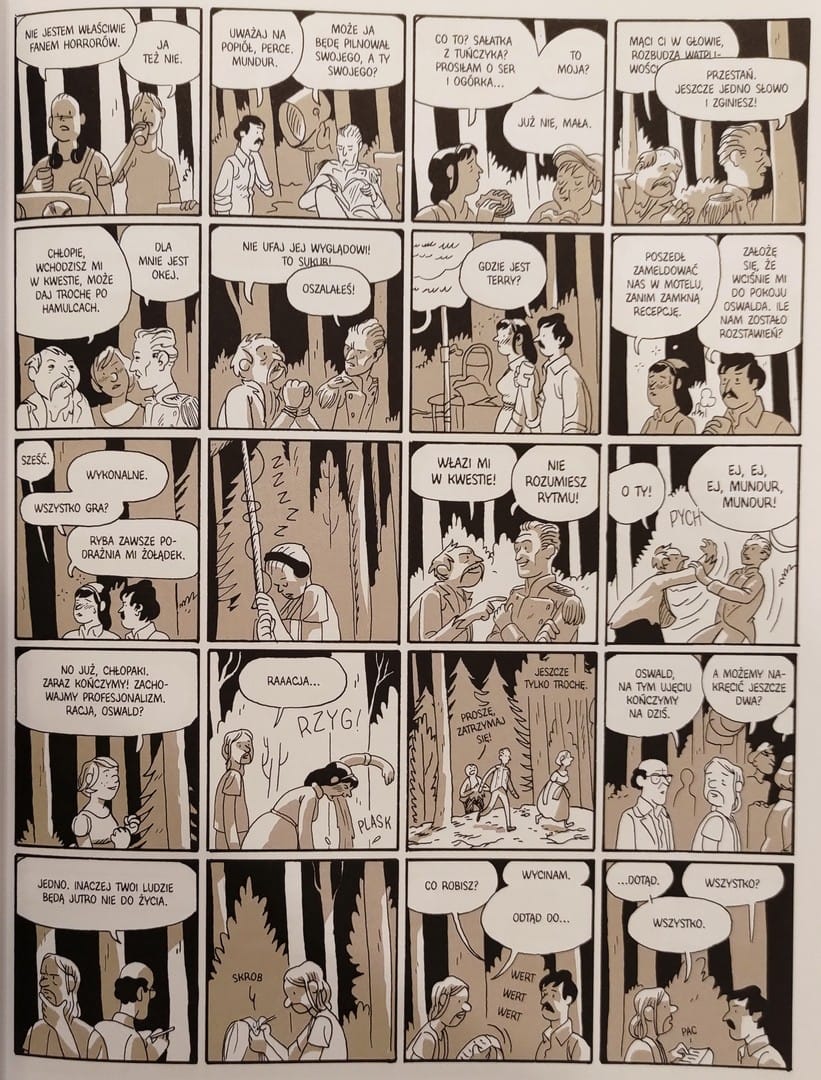 Na planie filmowym tempo zmienia się gwałtownie. Gęste siatki paneli, przyspieszone kadrowanie i ciasne ujęcia oddają presję czasu i napięcie budżetu. Momentami Harkham zatrzymuje scenę, pozwalając dostrzec drobne gesty, które stają się nośnikiem emocji i napięcia, wciągając czytelnika w rytm planu filmowego.