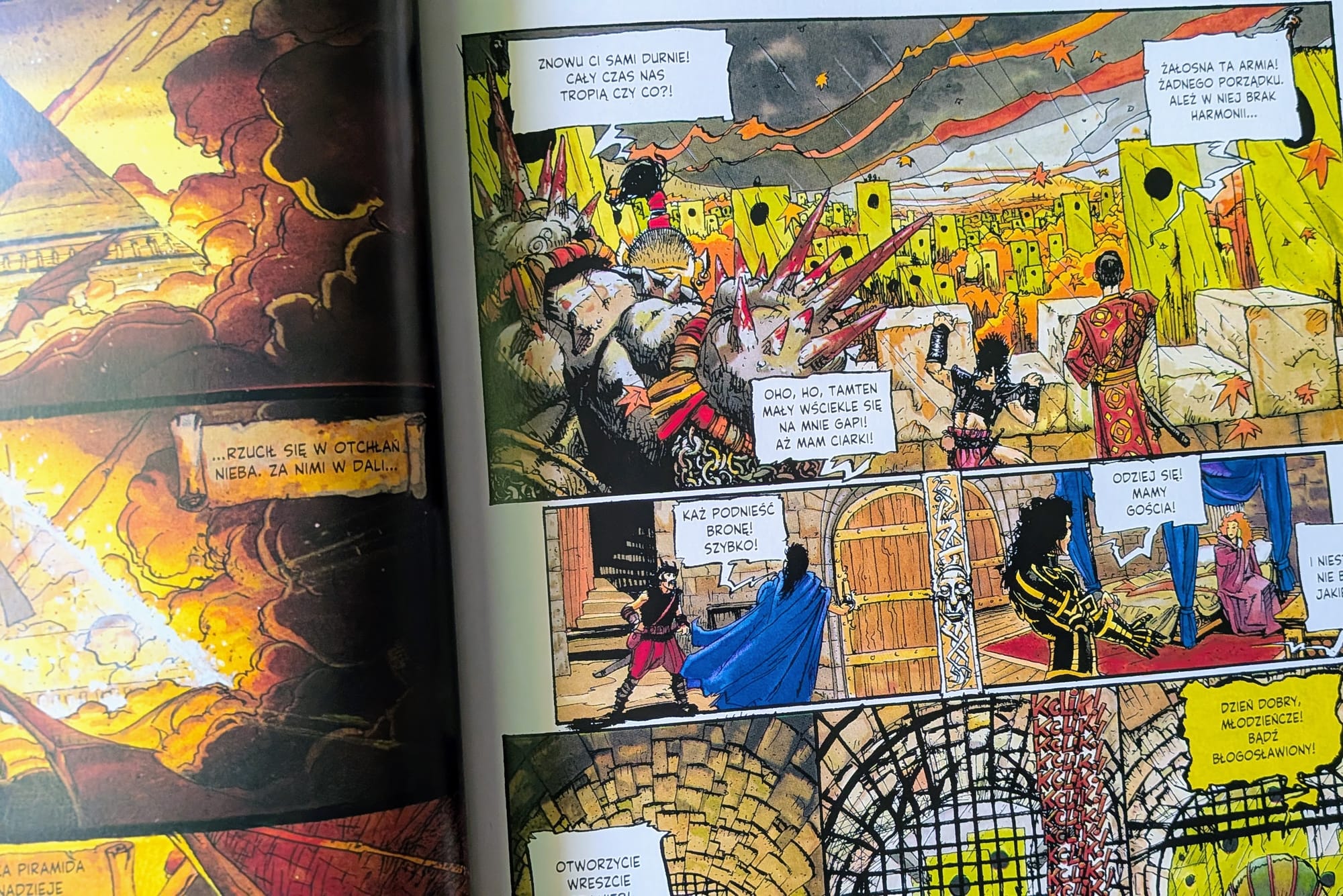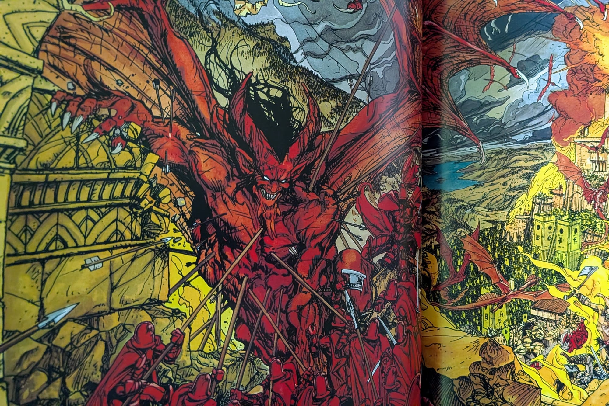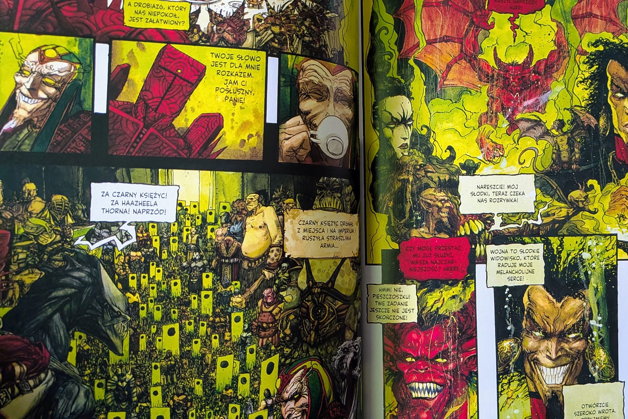 Zmiana tonu względem pierwszego tomu jest wyraźna. Tamten miał jeszcze energię kampanii RPG – bohaterowie wpadali w tarapaty, zbierali dziwacznych sprzymierzeńców i jakoś szli dalej. Tutaj beztroskiego łazikowania jest mniej, a zdrad, mobilizacji armii i rozmów prowadzonych przez istoty myślące w kategoriach strategii, nie przygody – więcej. To nadal komiks efektowny, brutalny i chwilami niemal operowy, ale ciężar historii wyraźnie rośnie.