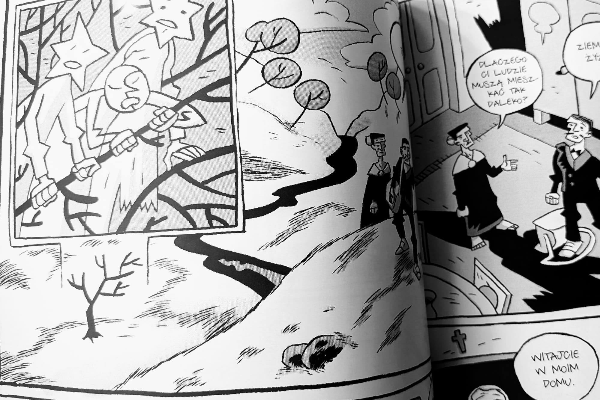 Najmocniejszą stroną albumu jest klimat — lekko senny, momentami wręcz oniryczny. Ogromną rolę odgrywają spersonifikowane postacie księżyca, gwiazd i śmierci. Kiedy na planszy pojawia się figura z ludzką sylwetką, ale z księżycem zamiast głowy — od razu wiadomo, że nie mamy do czynienia z realistycznym dramatem obyczajowym. Te figury wnoszą do opowieści coś niepokojącego i zarazem poetyckiego. Dzięki nim komiks zaczyna przypominać rytualny teatr obrazów, w którym symbole są równie ważne jak sami bohaterowie.