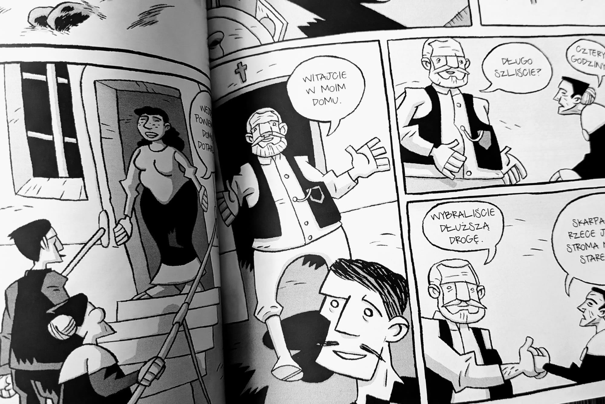 „Krwawe gody" nie próbują udawać kina — to komiks świadomie teatralny, oparty na geście, symbolu i starannie budowanym nastroju. Widać to też w rysunkach. Są oszczędne, czarno-białe, momentami surowe, ale właśnie dzięki temu dobrze współgrają z dramatem. Nie ma tu nadmiaru ozdobników. Jest za to chłód, geometryczność, pewna sztywność kadrów i twarzy, która jednym będzie przeszkadzać, a innym wyda się atutem. Ja zaliczam się do tej drugiej grupy — ta forma nie odbiera emocji, zmienia sposób ich wyrażania. Zamiast realistycznej ekspresji dostajemy poczucie obcowania z tragedią rozgrywaną poza czasem, niemal jak dawny mit albo przypowieść.