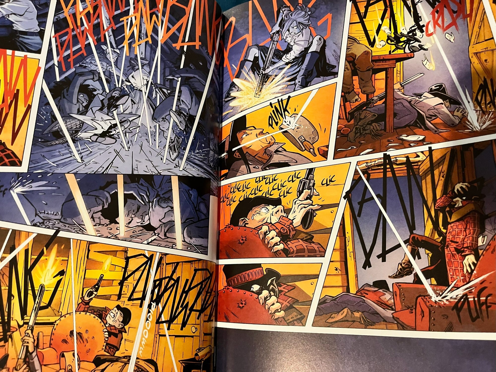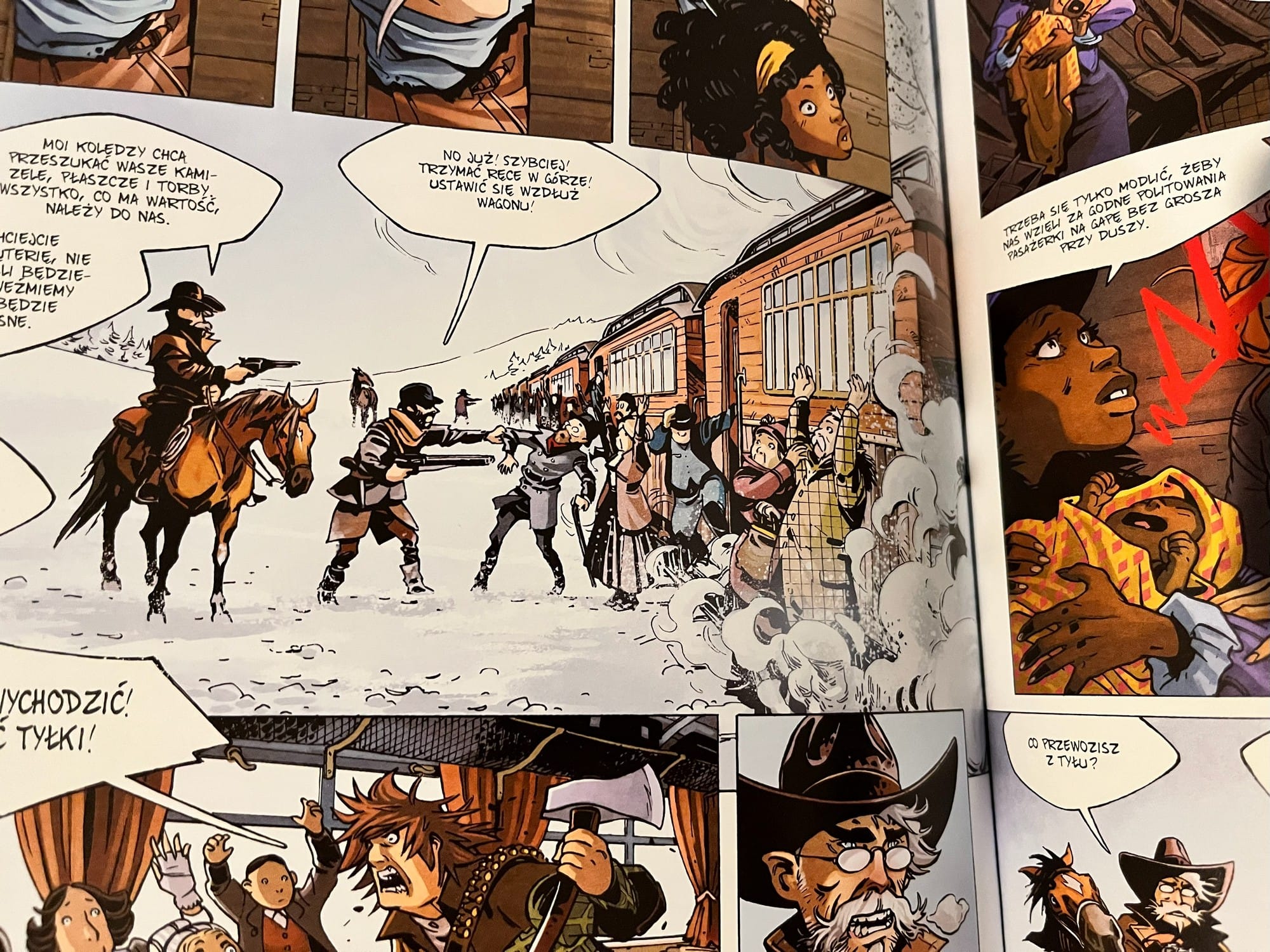 W czwartej części fabuła zamienia się w opowieść drogi. Trzeba przejechać kraj, przemykać między pościgami, łapać pociągi i unikać miejsc, gdzie plotki biegną szybciej niż konie. Ten album jest zbudowany z kilku większych przystanków, w których humor zderza się z twardszymi scenami. Bocquet gra rytmem: po napięciu daje chwilę oddechu, po żarcie wrzuca decyzję z ciężarem. Dzięki temu czyta się to płynnie i bez uczucia, że ktoś próbuje nas oszukać tanim zwrotem akcji.