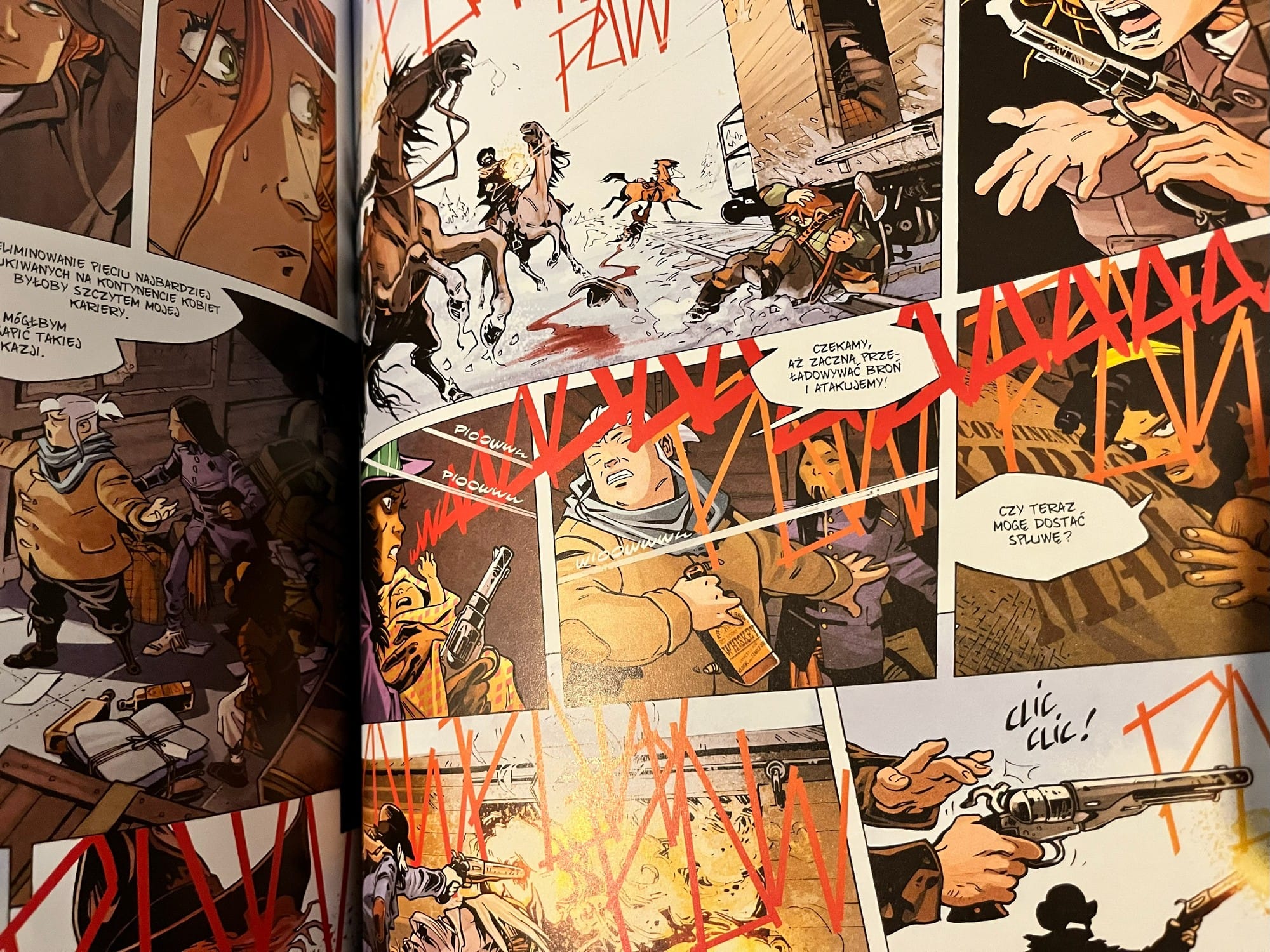 „Ladies with Guns” zaliczyć można do kategorii antywesternu. Bohaterkami jest pięć kobiet z różnych światów: emerytowana nauczycielka, Indianka, londyńska wdowa, pracownica domu uciech i nastoletnia zbiegła niewolnica. Łączy je przypadek, a potem wspólne doświadczenia. Każda z nich kieruje się czytelnym motywem i widać, że jest to opowieść o sprawczości, a nie o cierpieniu dla samego cierpienia. Drugi tom podkręca pościg i survivalowy ton. Dziewczyny uciekają, liczą zasoby, improwizują i co chwilę podnoszą poprzeczkę. Trzeci tom zamyka cztery bohaterki w męskim więzieniu, gdzie wszystko zależy od planu, inicjatywy i zimnej krwi.