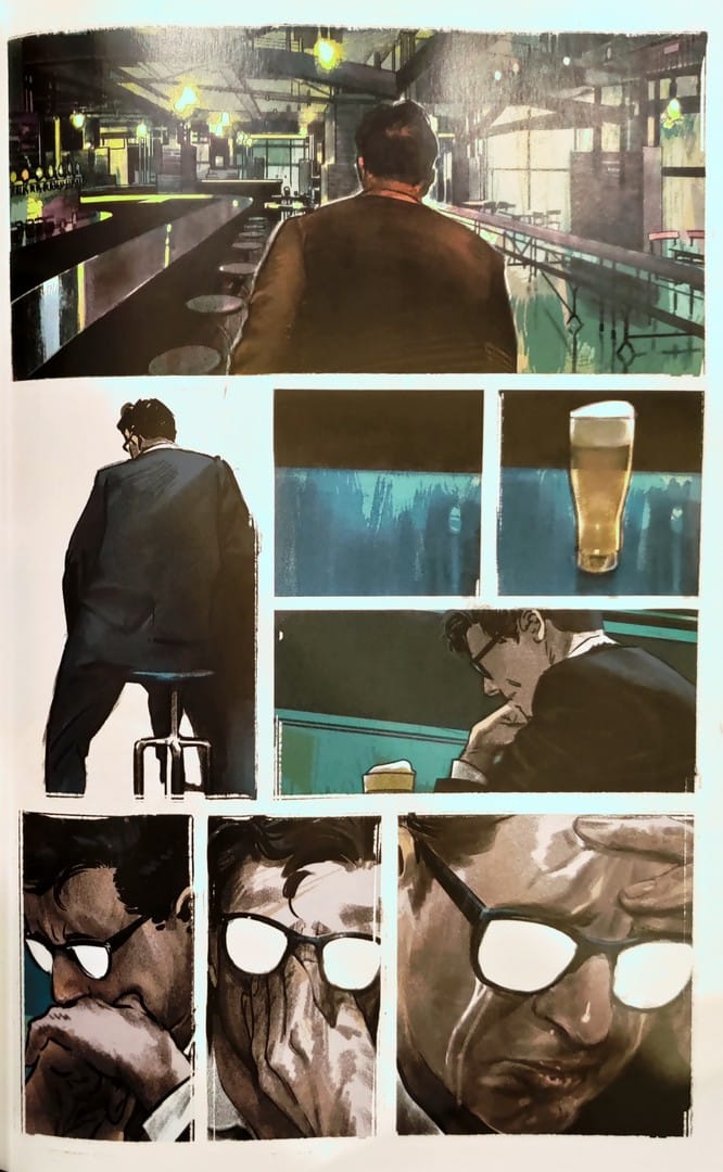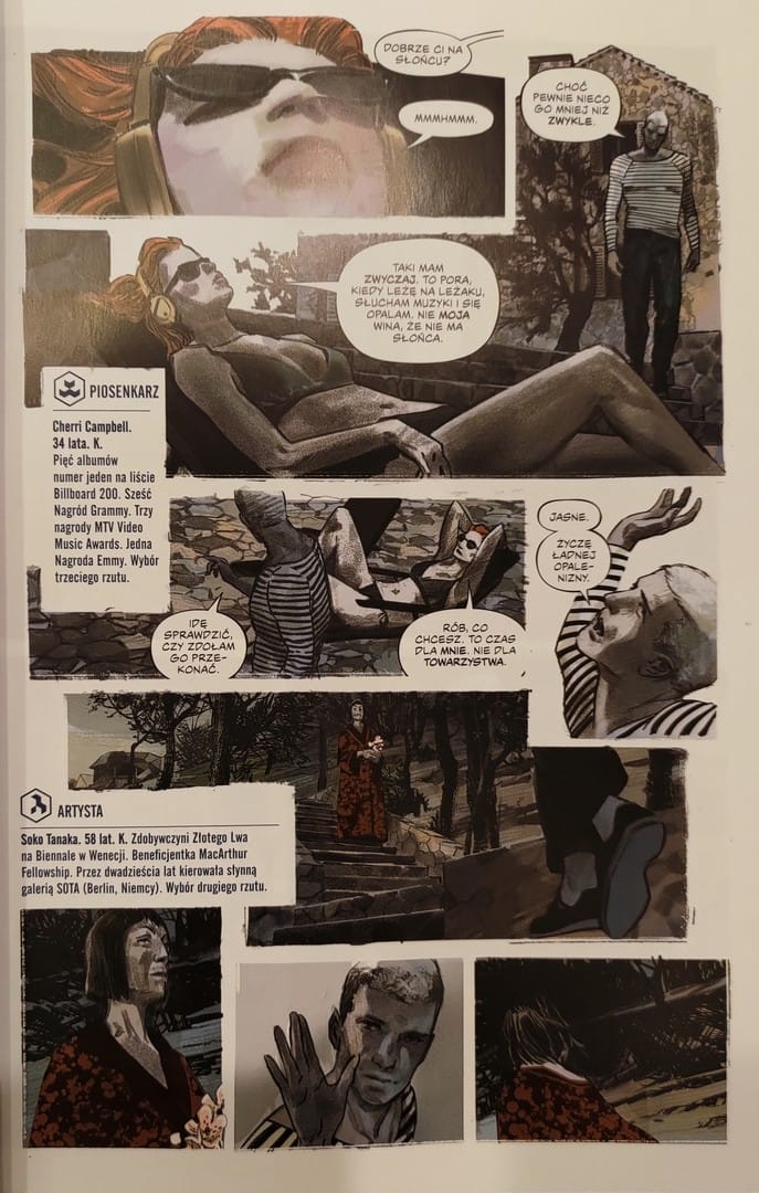 Gdybyście zamknęli oczy i kazali komuś opisać wam raj, zobaczylibyście właśnie to, co rysuje Martínez Bueno. Kreska jest czysta, elegancka, pełna światła. Postacie są wyraziste, twarze pełne emocji – od aroganckiego uśmieszku po moment kompletnego załamania. Ale to, co robi Bueno, to perfidna gra z percepcją. Bo pod tą idealną fasadą kryje się coś niepokojącego. Kadry są teatralne: długie, panoramiczne ujęcia willi przeplatają się z klaustrofobicznymi zbliżeniami na twarze. Dynamika paneli działa jak metronom napięcia - zwalnia, by wzmocnić grozę, przyspiesza, gdy ma eksplodować. Kąty kadrów są czasem minimalnie przekrzywione. Perspektywa płata figle. W jednej chwili podziwiamy widok na morze, by za chwilę zdać sobie sprawę, że to my jesteśmy obserwowani.