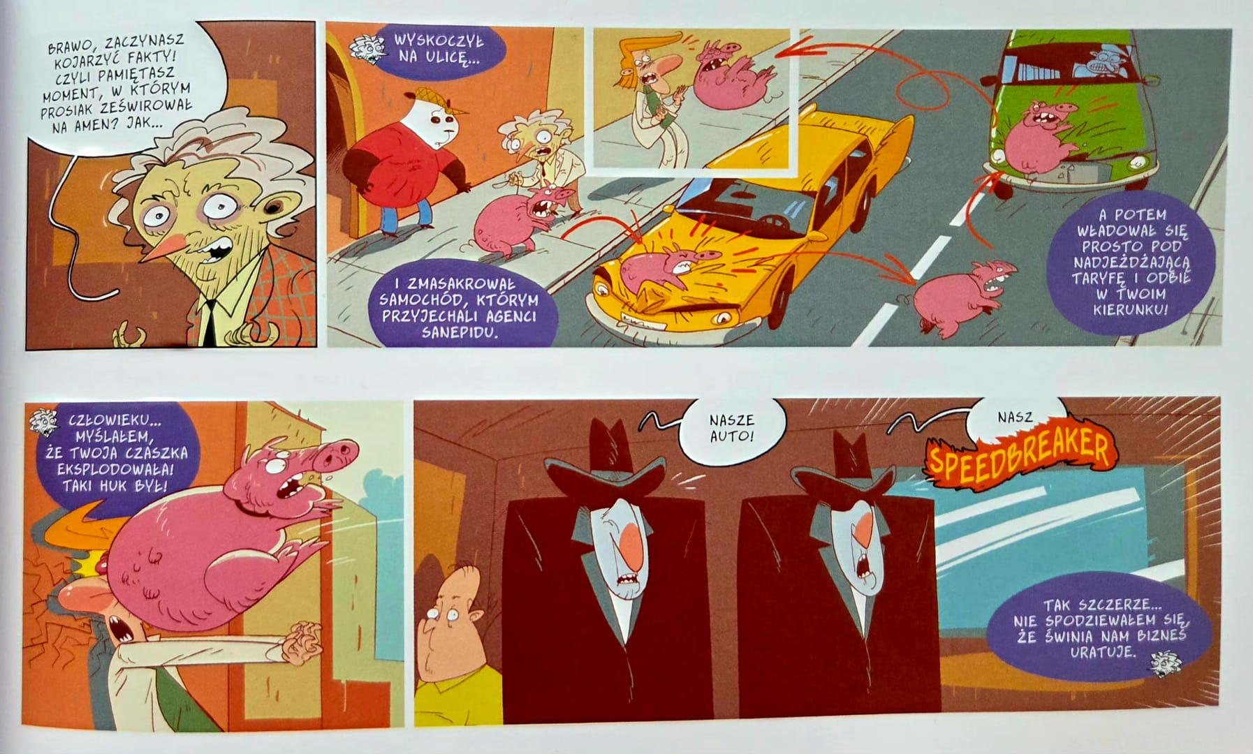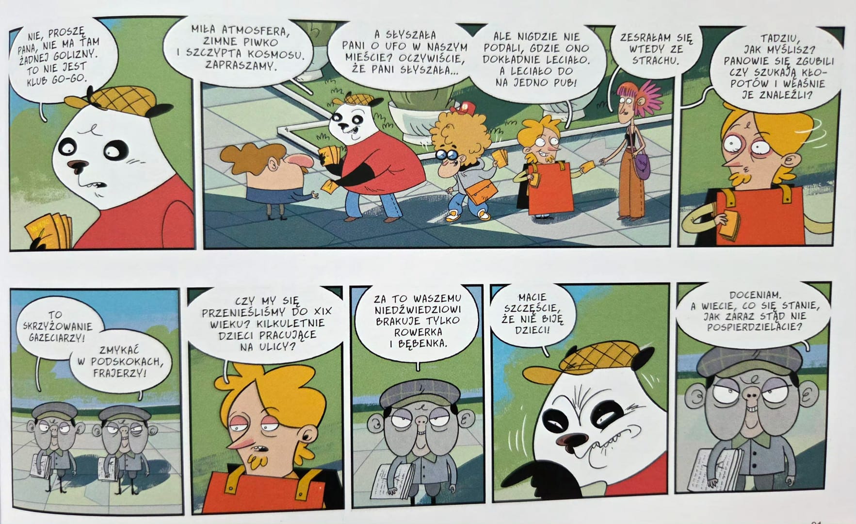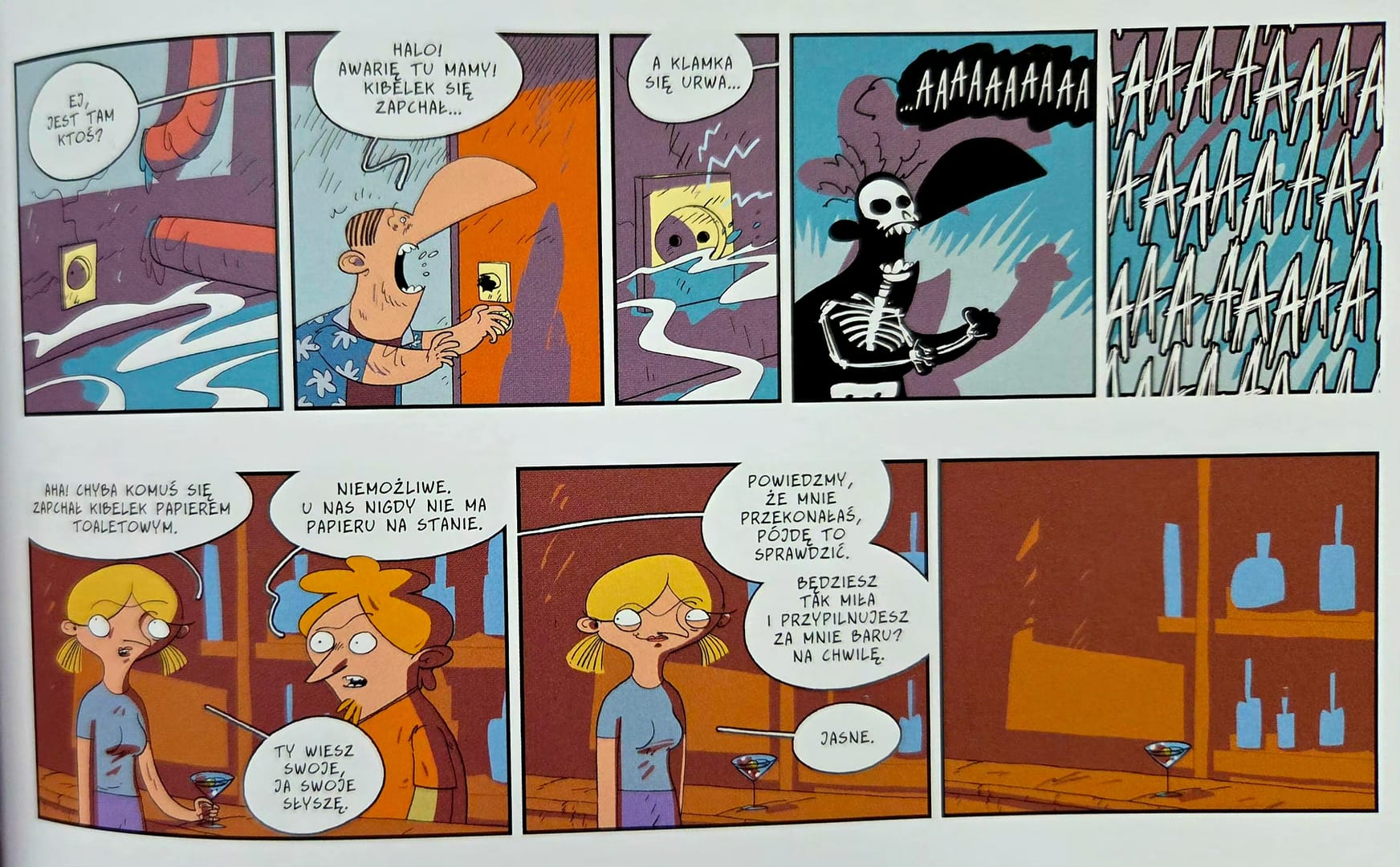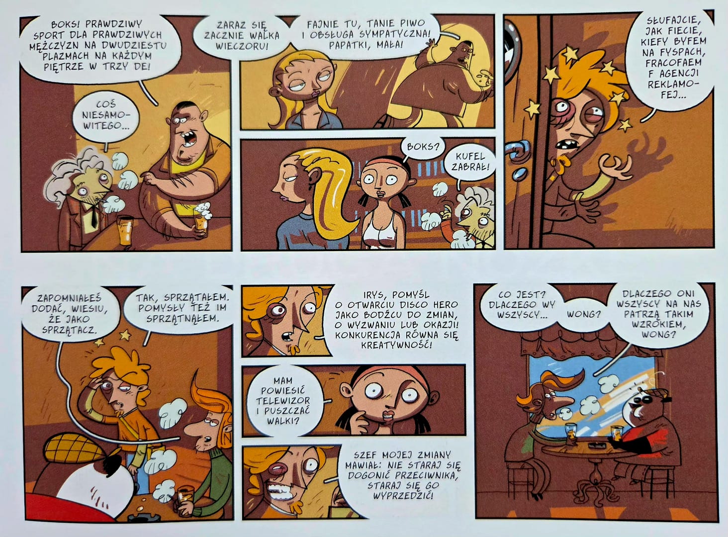Prawdziwe walki w pubie, gangsterskie porachunki z bombami w tle, niestandardowe i mocno szokujące warzenie firmowego piwa, trupy a nawet kosmici! Tak, dobrze czytacie. Wszystko to mieści się w tej niepozornej, niewielkiej objętościowo książce. I muszę przyznać, że poziomy format wydaje się tu rozwiązaniem wręcz idealnym dla zebranych pasków.