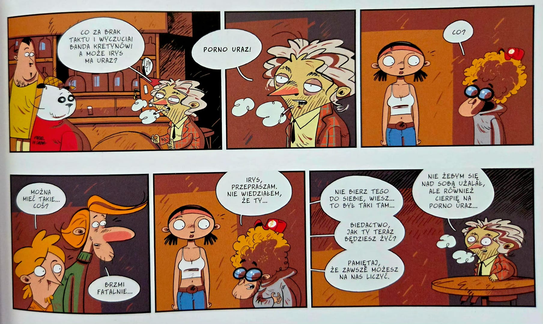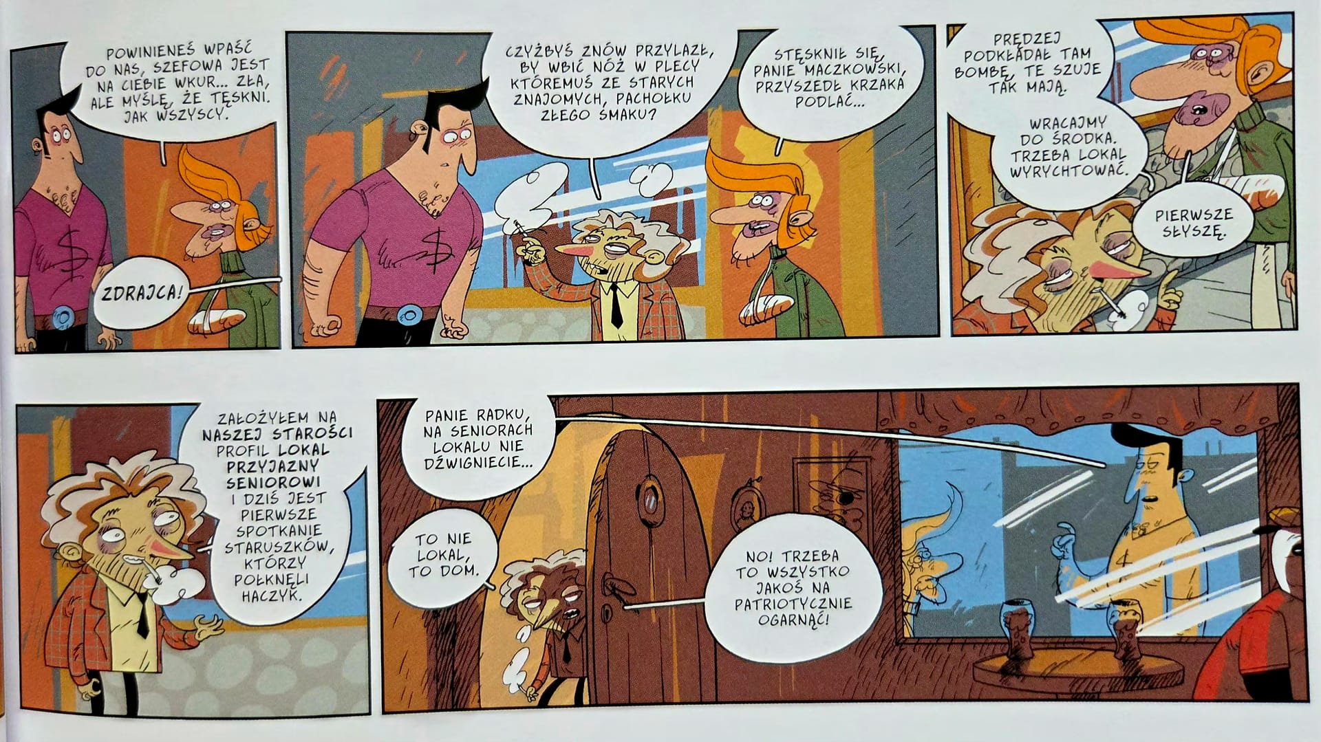 Nie dajcie się jednak zwieść pozorom, że macie do czynienia z błahym zbiorem prymitywnych gagów o piciu. Obaj autorzy to weterani polskiego komiksu i doskonale wiedzą, co robią. Ich tekst jest brutalnie szczerą diagnozą pewnego społecznego zjawiska. Mamy tu fascynujące, podszyte absurdem studium mikrospołeczności, która rozpaczliwie próbuje przetrwać w starciu z bezdusznym rynkiem. Świat przedstawiony tworzy hermetyczną bańkę, rządzącą się własnym, dziwacznym, ale zaskakująco konsekwentnym kodeksem honorowym.