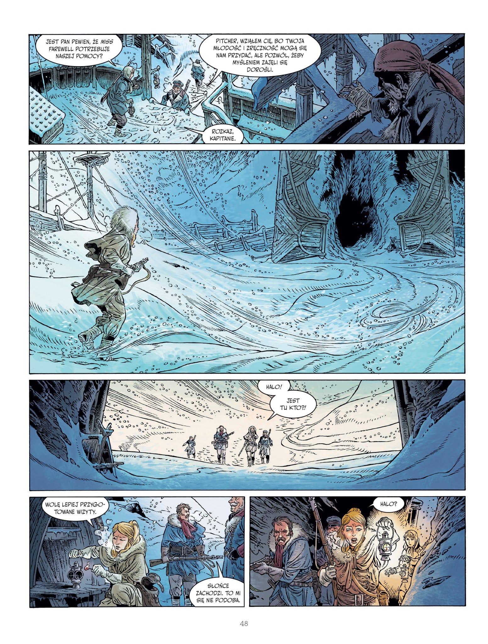Na uwagę zasługują rysunki. Czytelne, duże i bogate w szczegóły kadry sprawiają, że komiks czyta się bardzo lekko. Rysunki są przemyślane, perspektywy czyste, a architektura statków i masztów sprawia wrażenie konsultowanej z modelarzem. Śnieg nie jest po prostu białą plamą - to gradienty, drobiny i zawieje, które budują głębię. Warto odnotować pracę kolorysty Aleksandra Boucqa - zimne, niemal monochromatyczne tony Arktyki kontrastują z ciepłymi lampami świec i mahoniową fakturą angielskich wnętrz. Dzięki temu przeskoki między domem a piekłem północy niosą nie tylko dramaturgię scenariusza, ale też temperaturę barw.