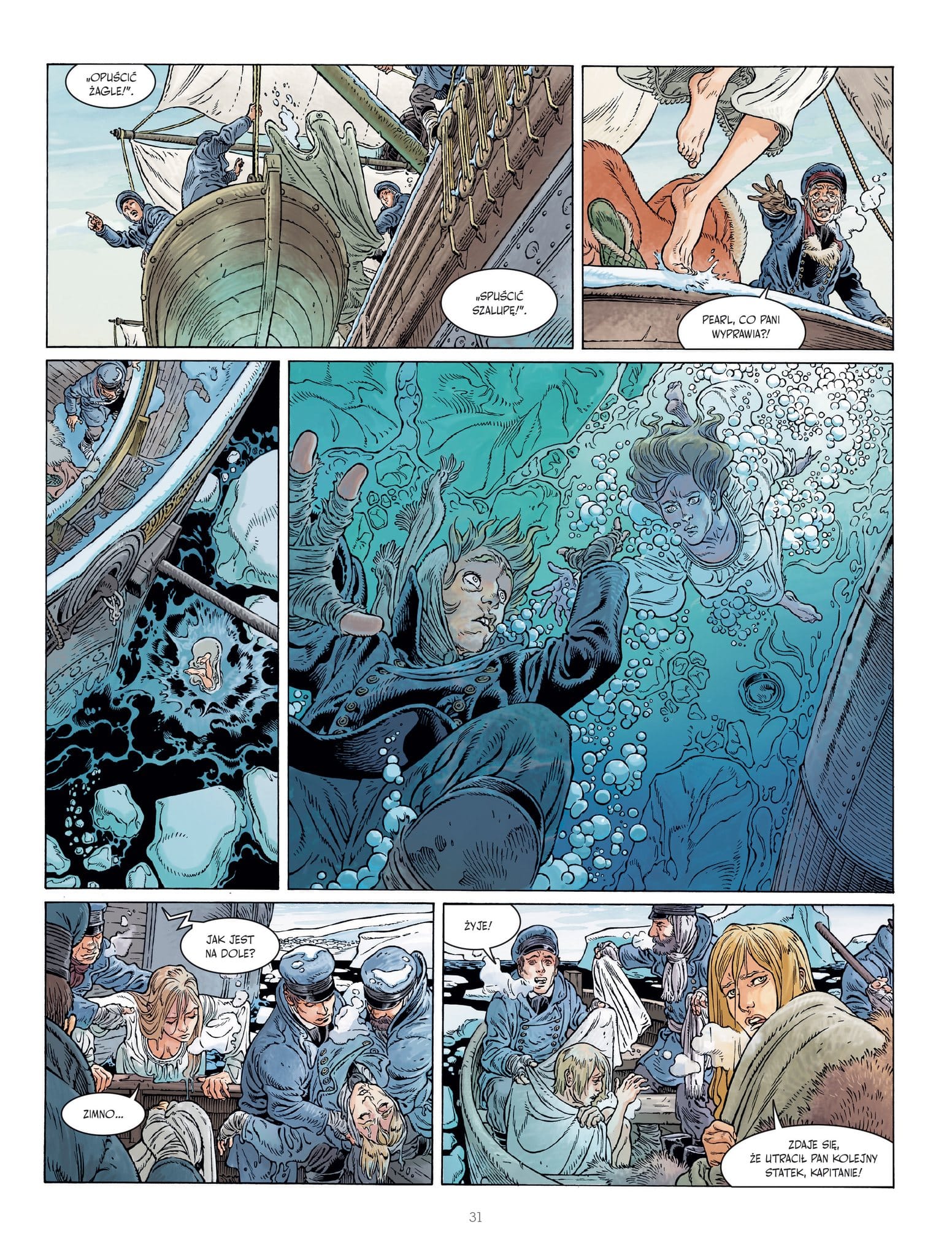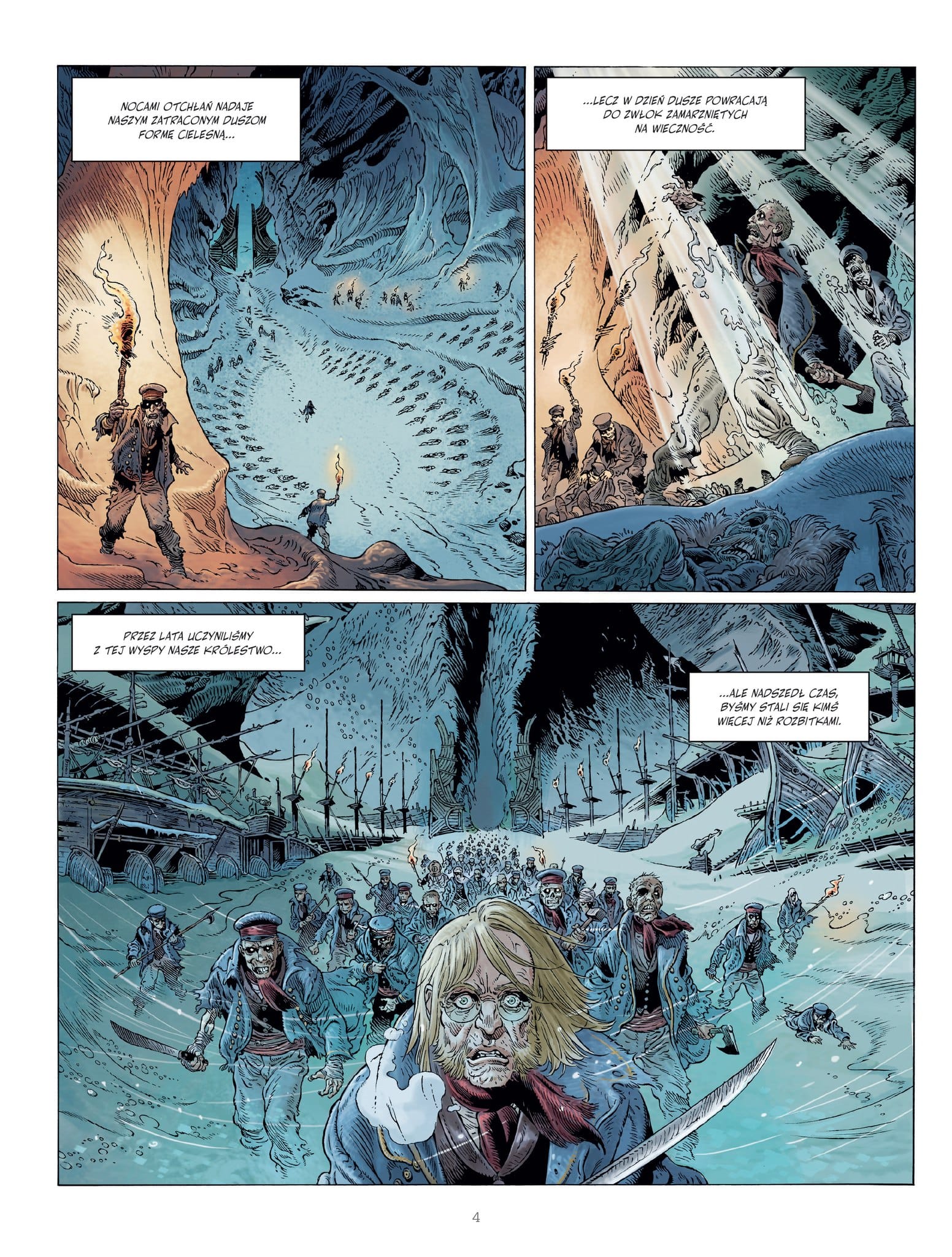 Siłą komiksu jest jego niepokojący klimat. Akcja rozpoczyna się w angielskich posiadłościach arystokracji, by stopniowo wraz z ekipą podróżników przenosić się na północne wody Arktyki. Najpierw mamy niepokój w salonach, potem zgrzytliwą logistykę wyprawy, w końcu biel, wiatr i ciszę lodu, która tłumi wszystkie odgłosy poza szeptem czegoś, co nie powinno mówić. Album rozwija się jak wyprawa, która powoli osuwa się w koszmar na granicy życia i śmierci. Napięcie nie wynika tu z gwałtownych zwrotów, tylko z poczucia narastającego zagrożenia. Do punktu kulminacyjnego, który przenosi ciężar opowieści w stronę dynamicznego horroru akcji. Scenarzysta zręcznie łączy motywy z literatury marynistycznej i dziewiętnastowiecznych opowieści niesamowitych z echem autentycznych katastrof polarnych.