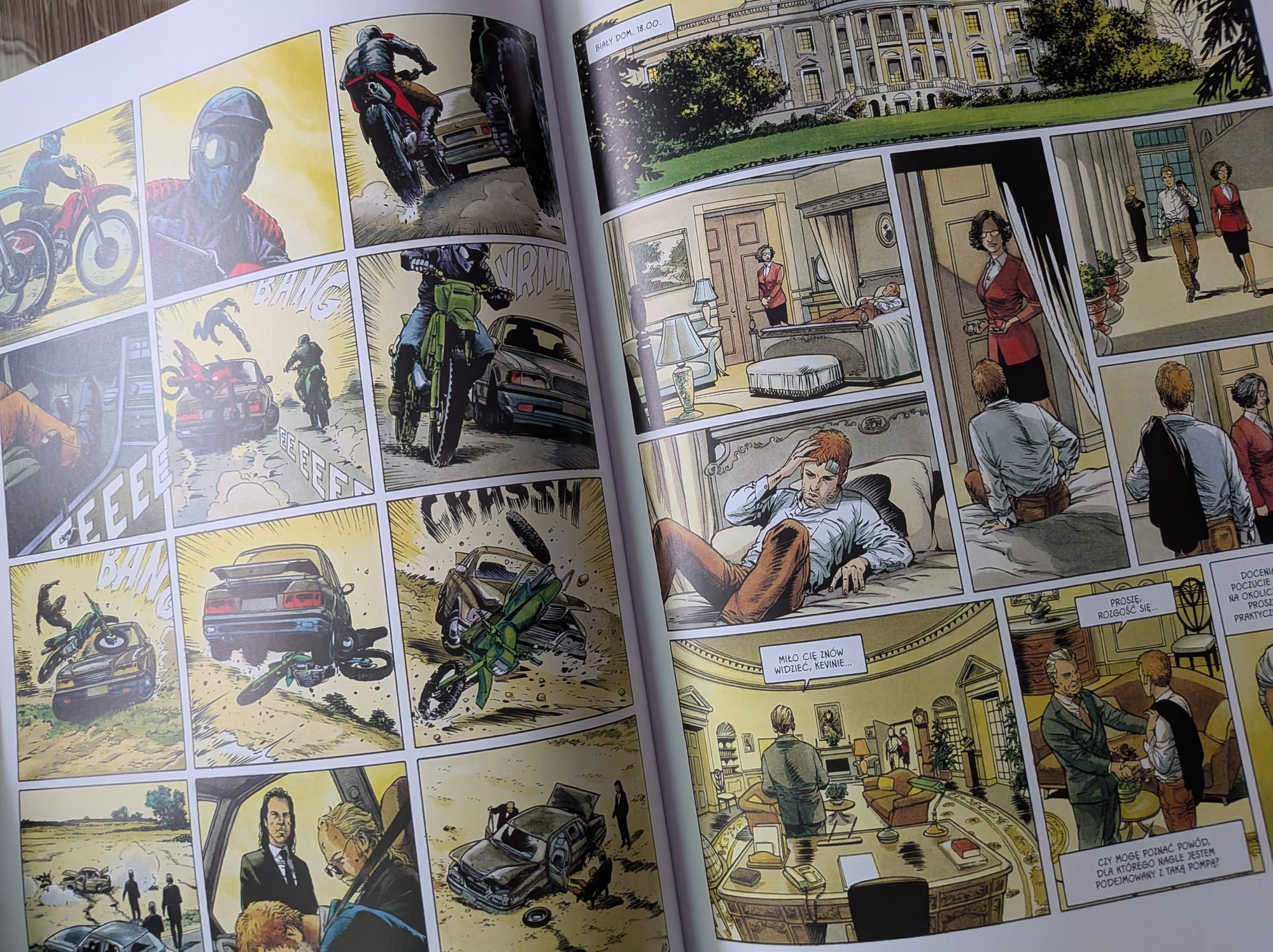 Komiks mocno pachnie przełomem wieków i nie chodzi tylko o to, że bohaterowie używają dyskietek czy telefonów z antenkami. Chodzi o sam styl opowiadania. Narracja opiera się na szybkich cięciach, nagłych zmianach perspektywy i kończeniu rozdziałów w momentach największego napięcia. To szkoła budowania paranoi, którą pamiętam z najlepszych filmów tamtego okresu, gdzie bohater nagle zdaje sobie sprawę, że jest obserwowany przez siły znacznie potężniejsze niż on sam. Choć dzisiaj technologia pokazana na kadrach może budzić uśmiech, to sam rytm opowieści w ogóle się nie zestarzał. Napięcie działa tak samo mocno jak dwadzieścia lat temu.