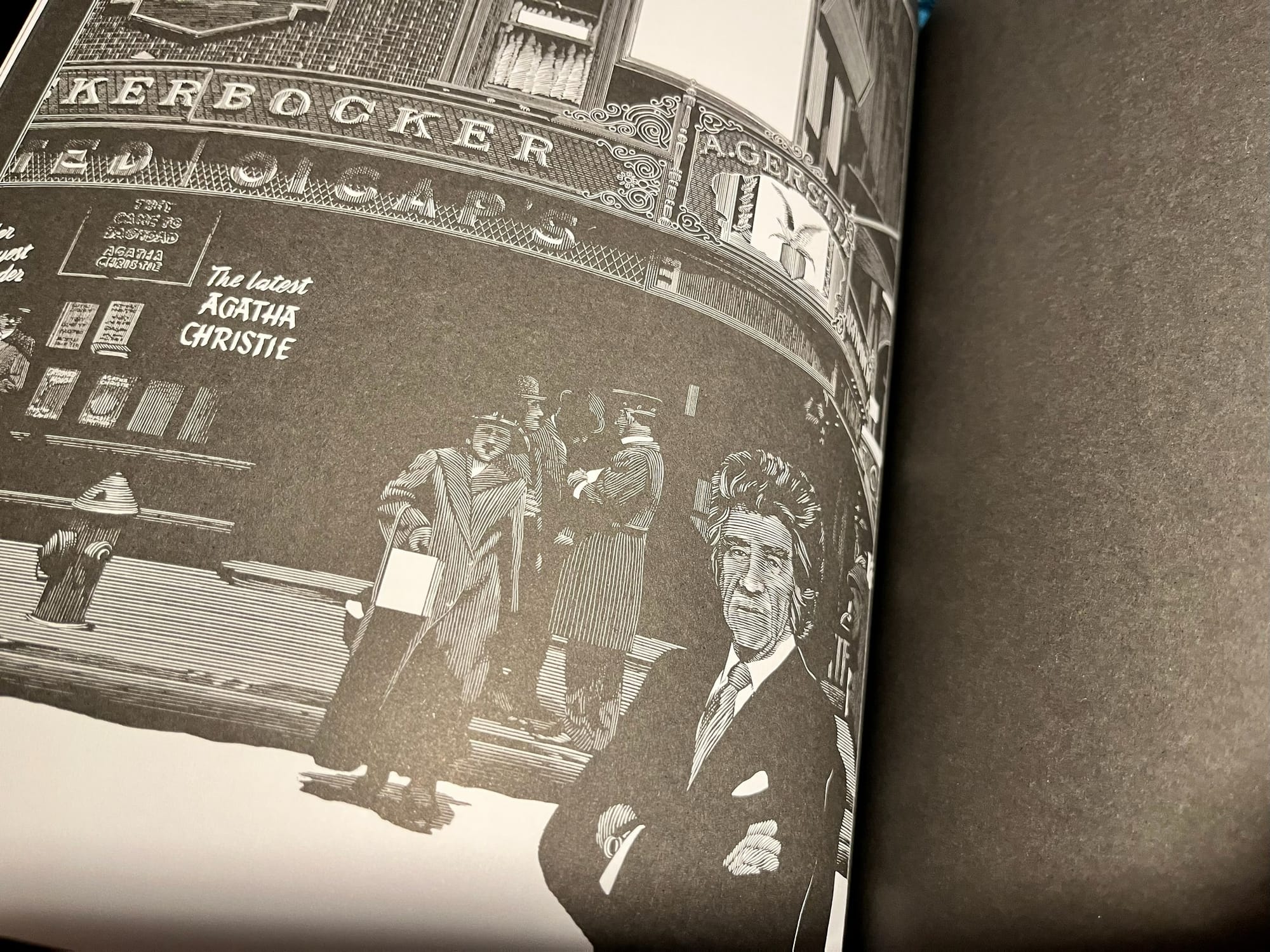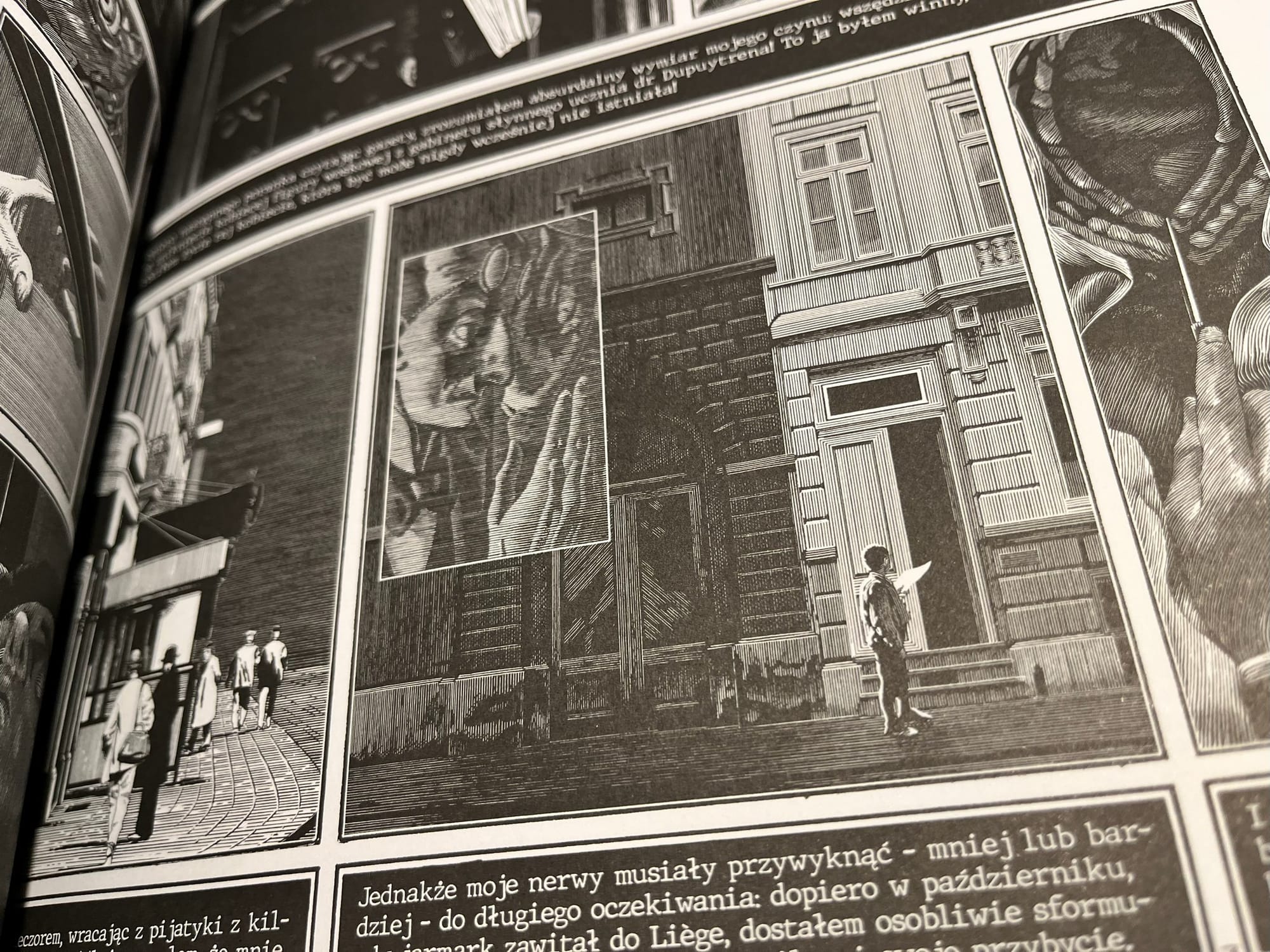 Rivière buduje krótkie opowieści, które udają szkice do biografii, a Andreas dokłada swoje mistrzowsko sterylne i “pokreskowane” kadry. Mam zresztą wrażenie, ale mogę się mylić, że niektóre późniejsze prace Andreasa były już mniej dokładnie pokreskowane niż te zamieszczone w “Pośmiertnych objawieniach”. Przy czym grafika Andreasa pracuje tu nieco inaczej niż w „Rorku”. Mniej jest halucynacyjnych przejść między panelami, więcej statycznej inscenizacji, która imituje dokument. Drobiazgowe kreskowanie, ostre linie architektury, smugi światła w pionowych pasach – wszystko, co charakterystyczne dla stylu Andreasa.