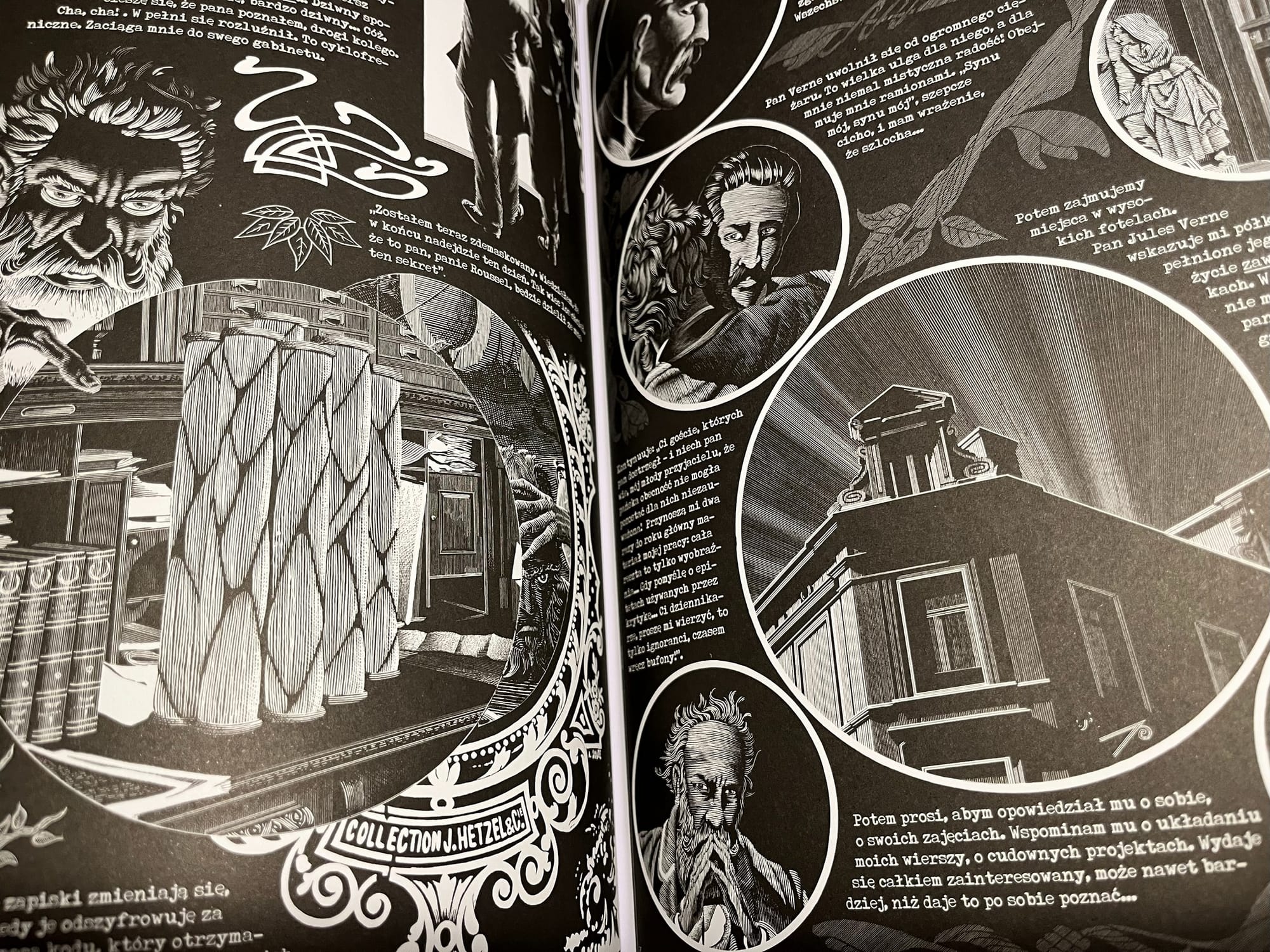 Fabuła opowiada fikcyjne epizody z życia wielkich pisarzy, ale ujęte w ten sposób, by kojarzyły się z rekonstrukcjami z przełomu XIX i XX wieku. By uściślić - w tym albumie nie ma standardowych dymków narracyjnych, a jedynie boksy z narracją. Na uwagę zasługuje jednak ten specyficzny styl opowiadania - mnie kojarzył się z prozą H.P. Lovecrafta czy R.E. Howarda. Stąd też w zasadzie dymki z dialogami są tu niepotrzebne, bo narrator prowadzi to w formie relacji lub pamiętnika. Nie ma tu rozbuchanej intrygi ani puent w stylu kina gatunkowego. Jest rytuał podglądania.