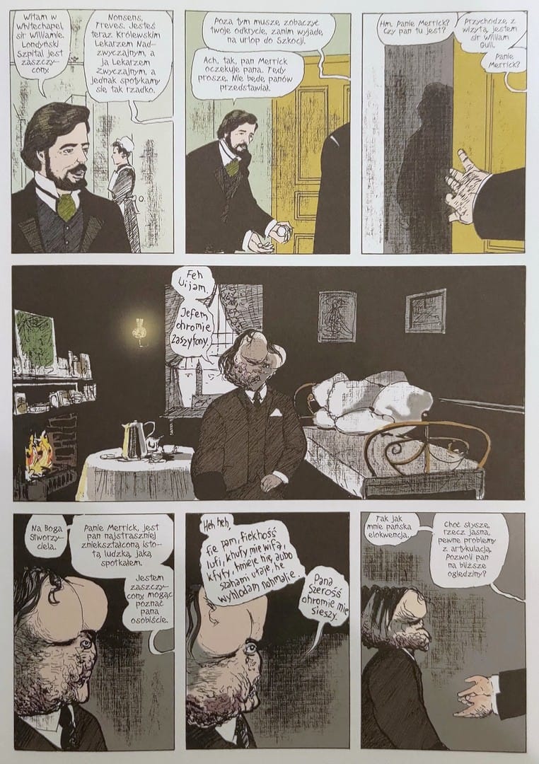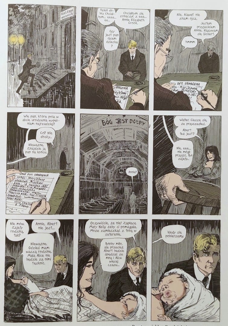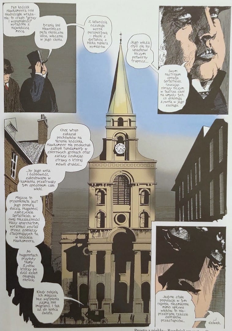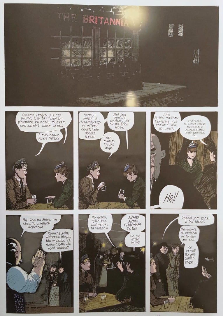 No i teraz przejdziemy do warstwy graficznej. Dlaczego Eddie Campbell postanowił zmienić oryginalną wersję? Pierwotnie czarno-białe plansze Campbella miały surowość dziewiętnastowiecznej ryciny prasowej. Linie drżały, bywały szkicowe, momentami chropowate. Ta brudna kreska doskonale oddawała smród i beznadzieję slumsów. Po latach artysta zdecydował się na kolor oraz subtelne korekty.