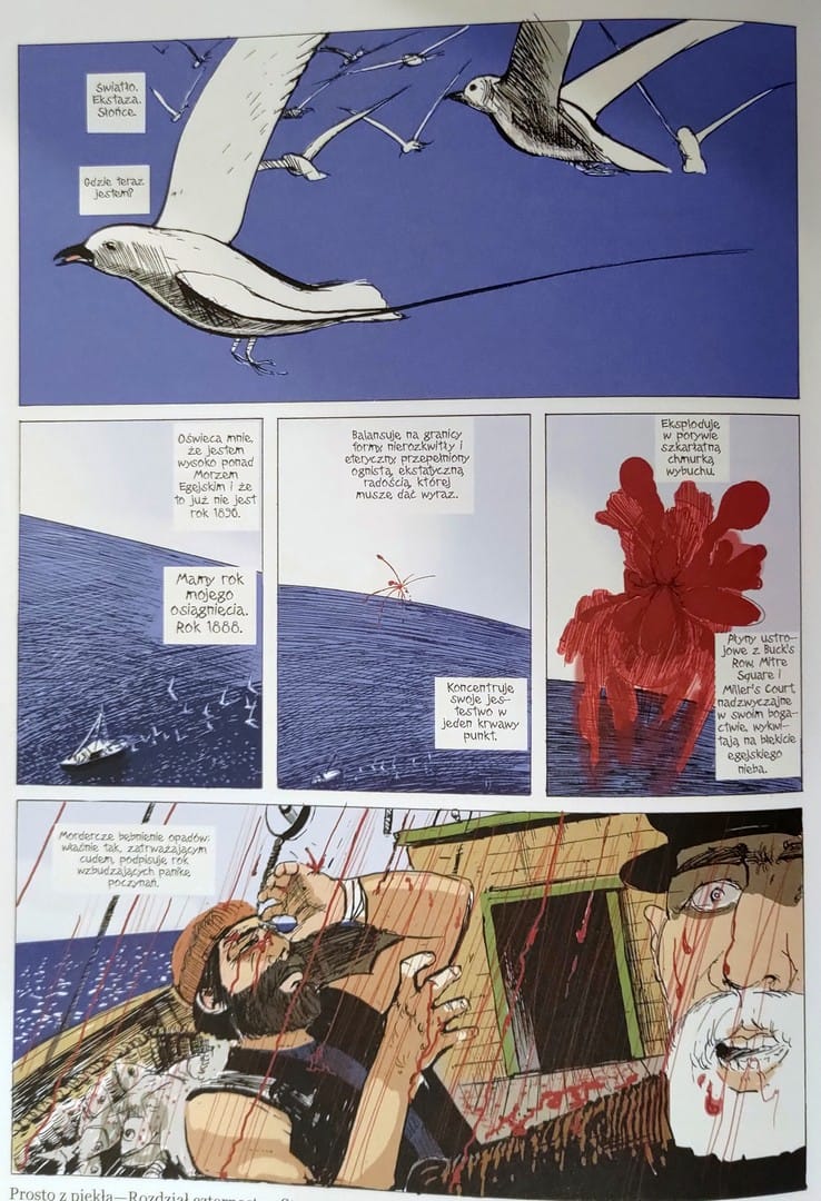 Kolor pozwolił pełniej oddać halucynacyjne wizje Gulla. Przejścia między szarym, brudnym Londynem a ognistymi, proroczymi majakami stały się bardziej sugestywne. Oczywiście użyte kolory w znacznym stopniu to przygaszone i stonowane barwy, idealnie oddające klimat poznawanej historii. I choć purystom może brakować czarno-białej surowości, to moim zdaniem wersja kolorowa pogłębia doświadczenie i sprawia, że komiks jest jeszcze lepszy w odbiorze.