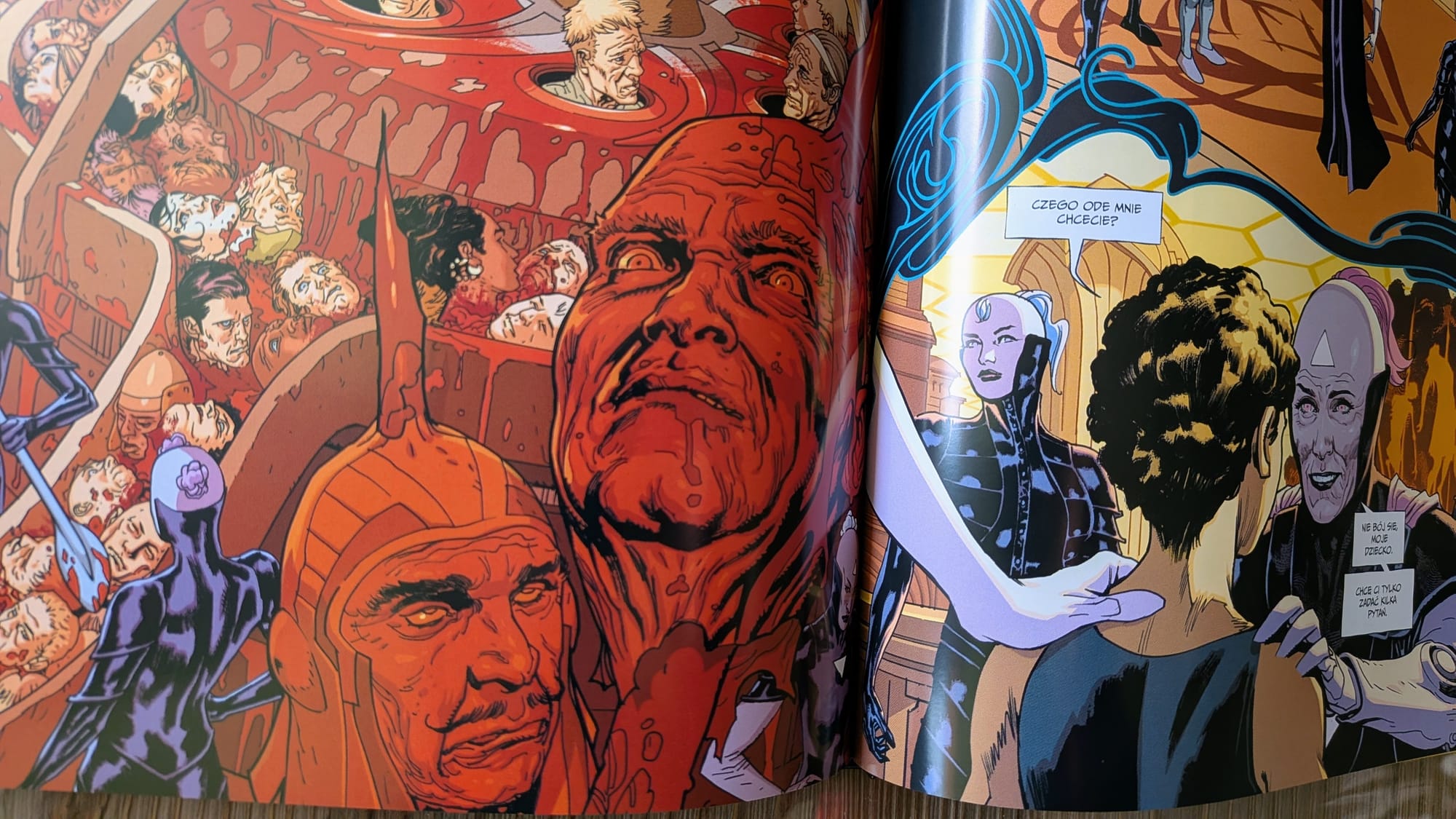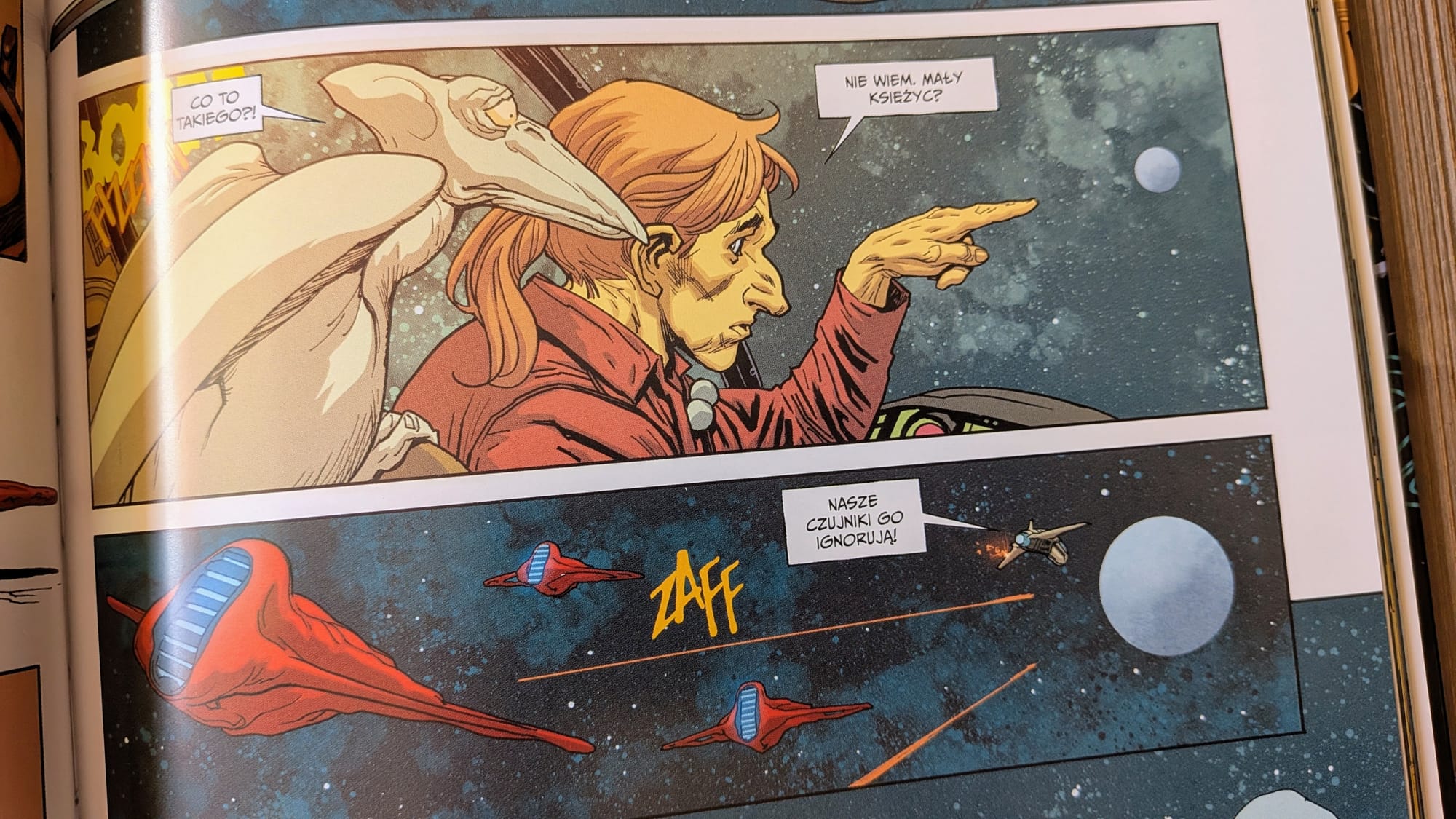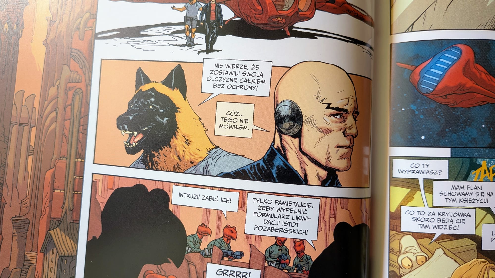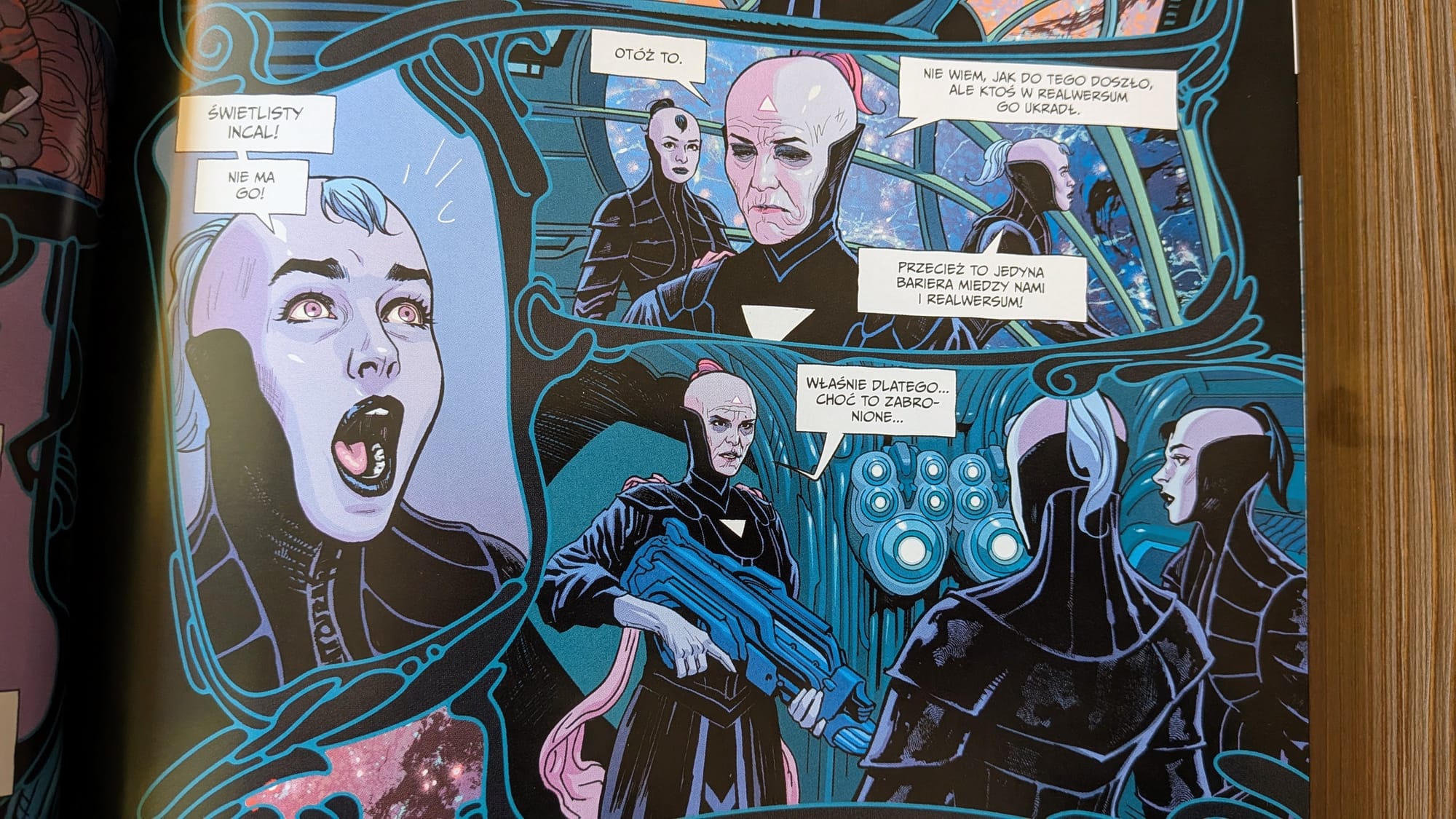 Na osobną pochwałę zasługuje warstwa wizualna. Ten komiks wygląda dokładnie tak, jak powinno wyglądać kosmiczne science fiction z pogranicza przygody, groteski i metafizyki. Kadry są dynamiczne, świat przedstawiony bogaty, a projekty postaci i miejsc mają w sobie coś jednocześnie klasycznego i świeżego. To nie jest sterylna, chłodna fantastyka – to świat gęsty od symboli, kolorów, faktur i dziwności. Taki, w którym wszystko może się wydarzyć, a jednak nic nie wydaje się przypadkowe.