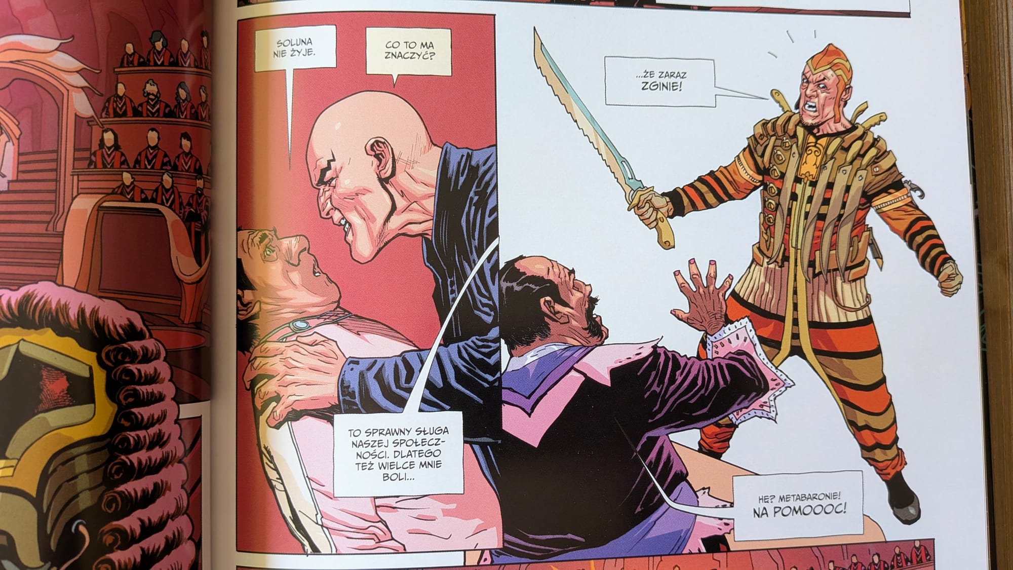 Bardzo podoba mi się to, że „Psychowersum" nie próbuje wszystkiego tłumaczyć do bólu. Ten świat po prostu jest. Ma swoje reguły, swoje obsesje, swój język i swoją logikę – pokrętną, ale właśnie przez to intrygującą. Czasem jest w tym coś wręcz onirycznego, czasem kampowego. Autorzy podsuwają idee, które w innym komiksie brzmiałyby śmiesznie, a tu stają się naturalną częścią opowieści. Dobrym przykładem jest wątek systemu wartości Metabaronów – jeden z tych elementów, które potrafią czytelnika zszokować, ale dla bohaterów tego uniwersum są niemal oczywistością.