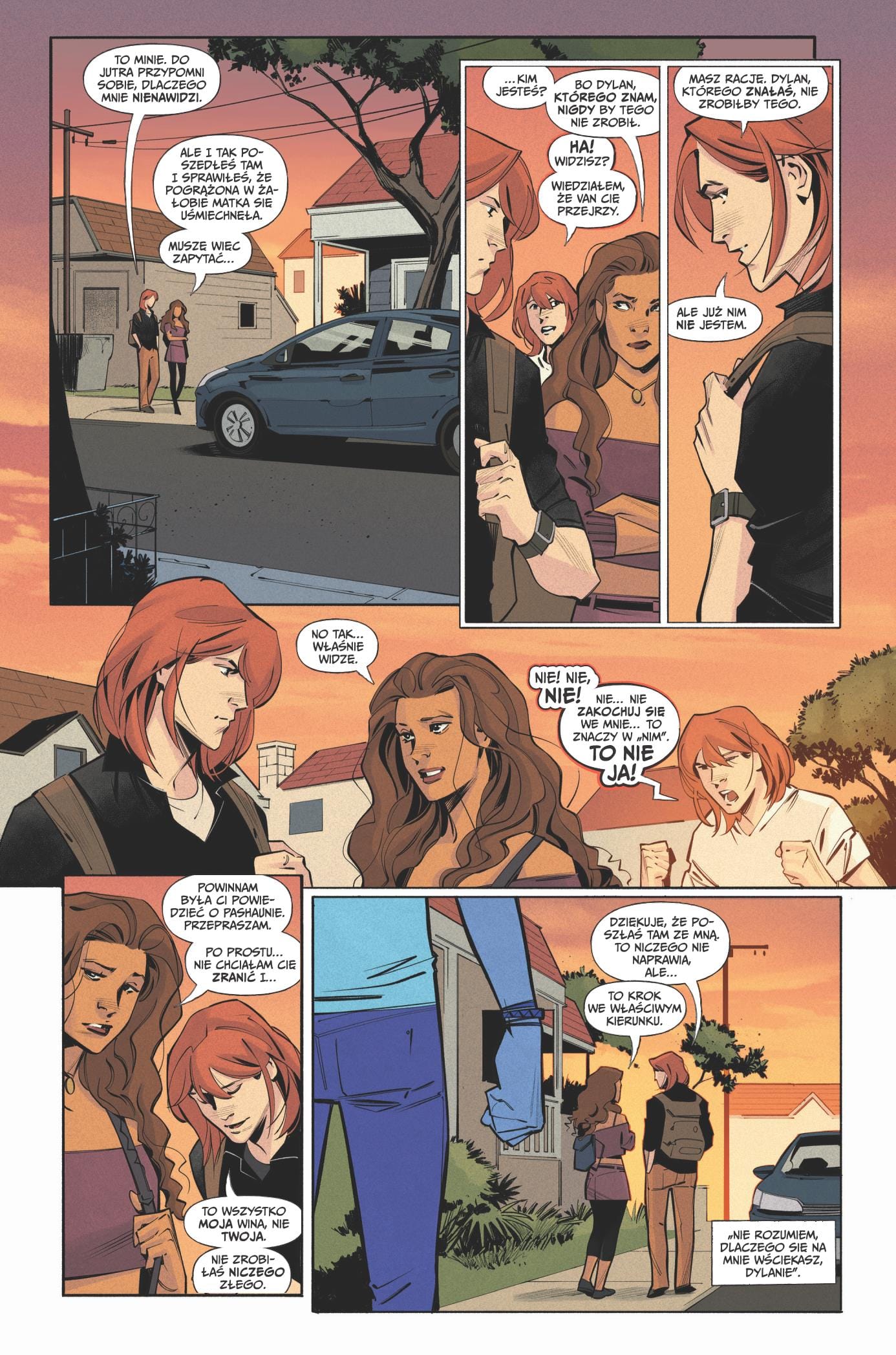 Siłą trzeciego tomu „Knight Sun” jest to, że komiks bierze dobrze znany motyw „dziedzictwa” i robi z niego realny dramat o utracie tożsamości. Dylan nie tylko traci pancerz. Traci też prawo do własnej narracji, bo ktoś inny chodzi w jego skórze, rozmawia z jego bliskimi i podejmuje decyzje, które później spadają na niego. To świetny, a zarazem bardzo niewygodny pomysł, bo w klasycznych historiach o superbohaterach „ktoś inny w kostiumie” bywa tylko chwilowym twistem. Tutaj staje się osią tomu i komentarzem do tego, jak łatwo dziedzictwo może zostać przejęte przez kogoś, kto ma większy staż i większą pewność siebie, ale niekoniecznie lepszy kompas moralny.