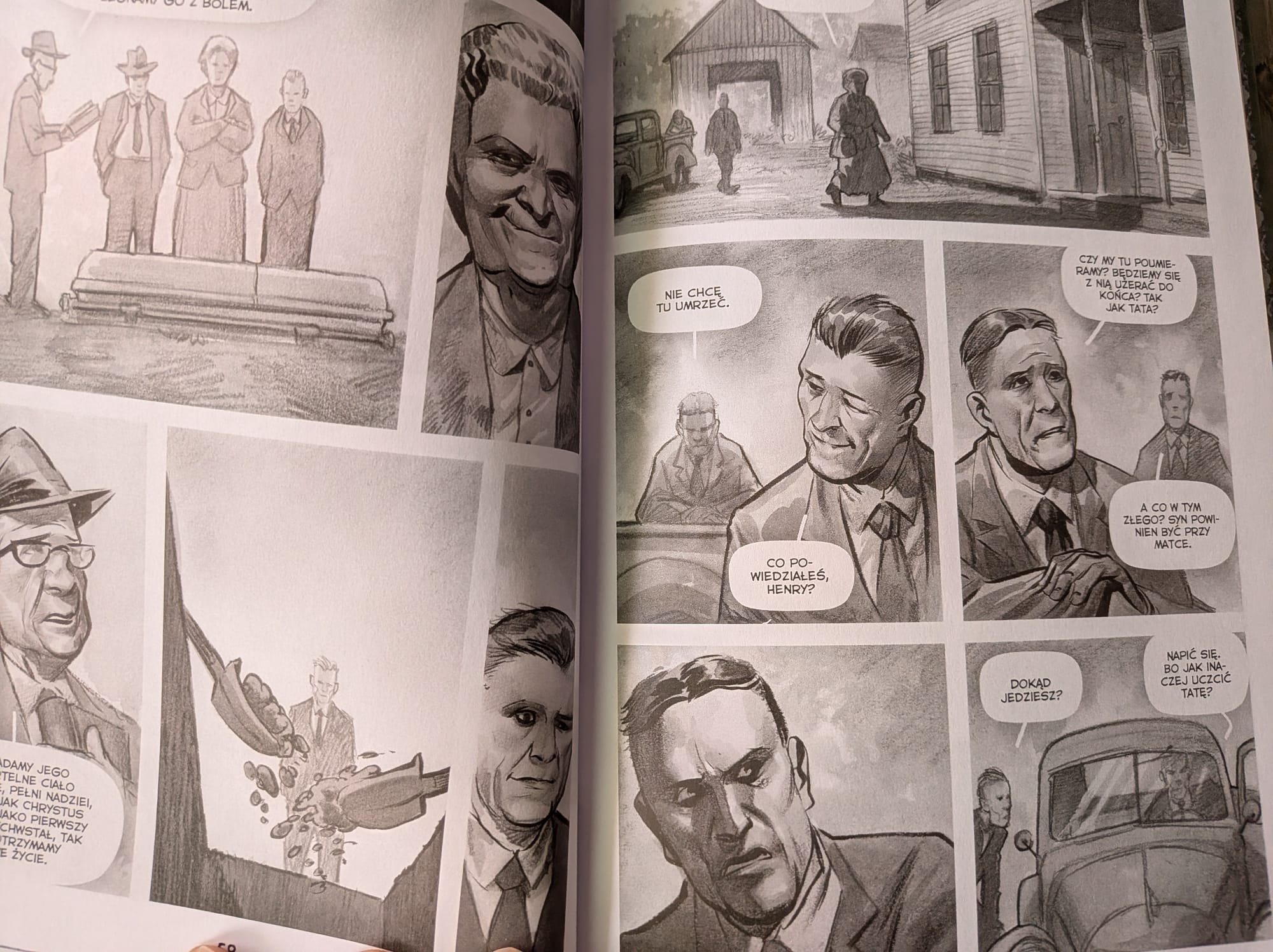 Powell natomiast rysuje w taki sposób, że widać ciężar otaczającego świata, a nie tylko „atrakcje” fabuły. Odcienie czerni i bieli sprawdzają się tu idealnie, bo ten komiks nie potrzebuje kolorów, by zostawić trwały ślad. Właśnie w tej oszczędności tkwi siła. Są kadry, które nie krzyczą, ale długo nie dają o sobie zapomnieć. I co ważne, nawet gdy pojawiają się naprawdę trudne obrazy, nie ma w tym żadnego popisywania się. Jest chłód, brud, prowincja i samotność. To w zupełności wystarcza.