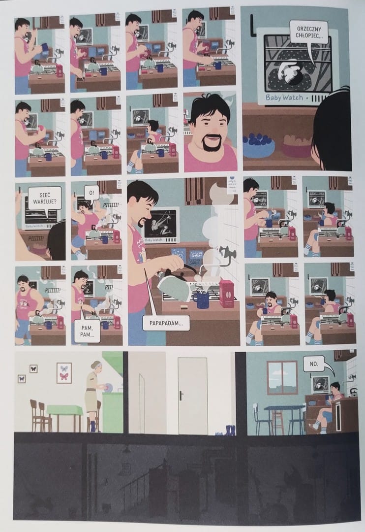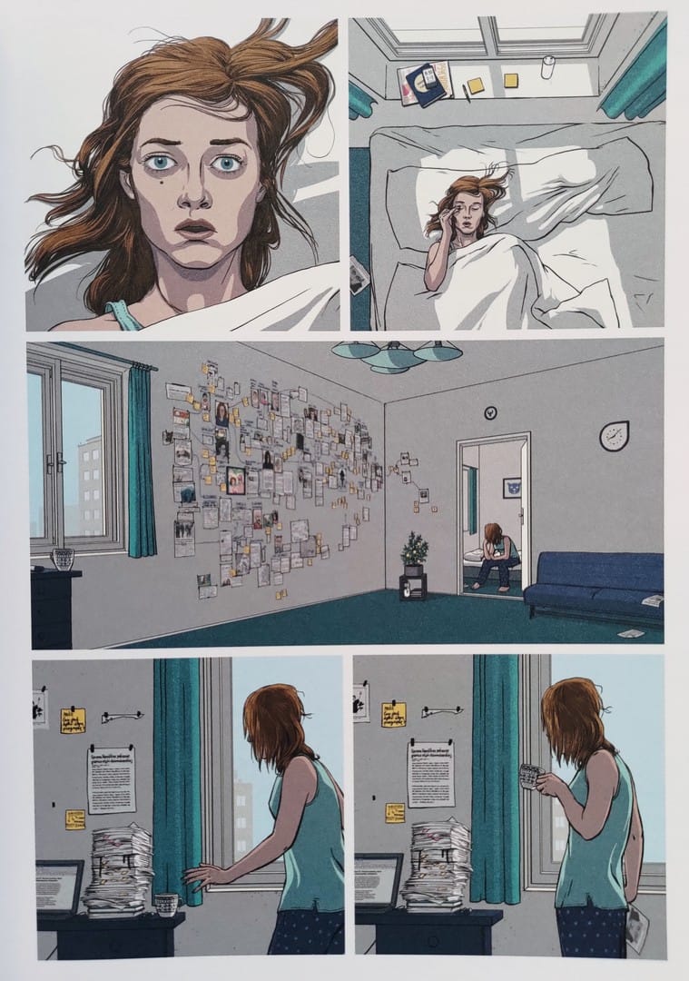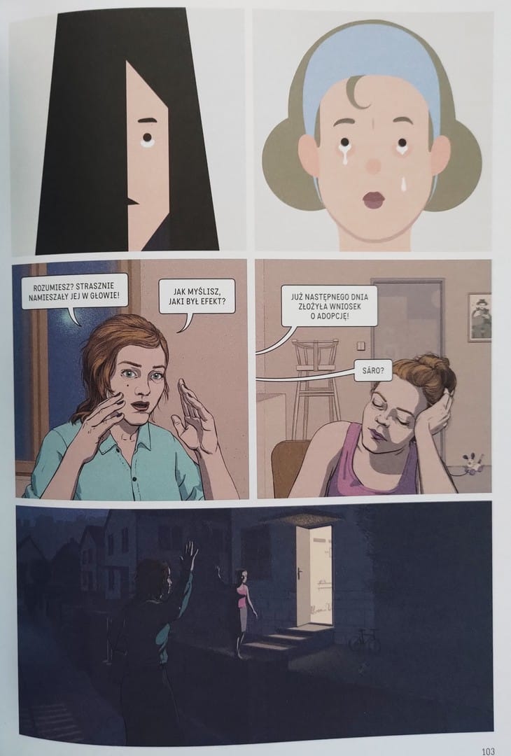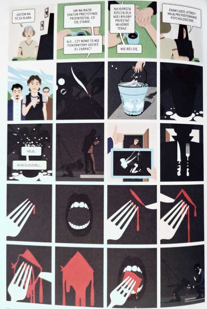 Pokorný bawi się kompozycją, mieszając ciasne, klaustrofobiczne ujęcia, które zamykają czytelnika w pułapce umysłu, z szerszymi panelami, gdzie przestrzeń oddycha, ale tylko po to, by podkreślić izolację postaci. Kompozycja stron pracuje na niepokój. Rysunki zamykają czytelnika w głowie bohaterów, szerokie panele dają chwilę oddechu tylko po to, by podkreślić samotność i pustkę. Różne rozmiary kadrów, puste przestrzenie, dwustronicowe plansze zestawione z drobnymi, niemal dusznymi sekwencjami - wszystko tu jest podporządkowane tajemniczej atmosferze.