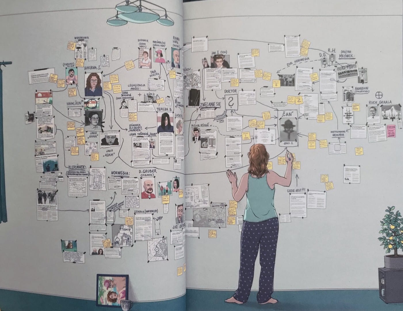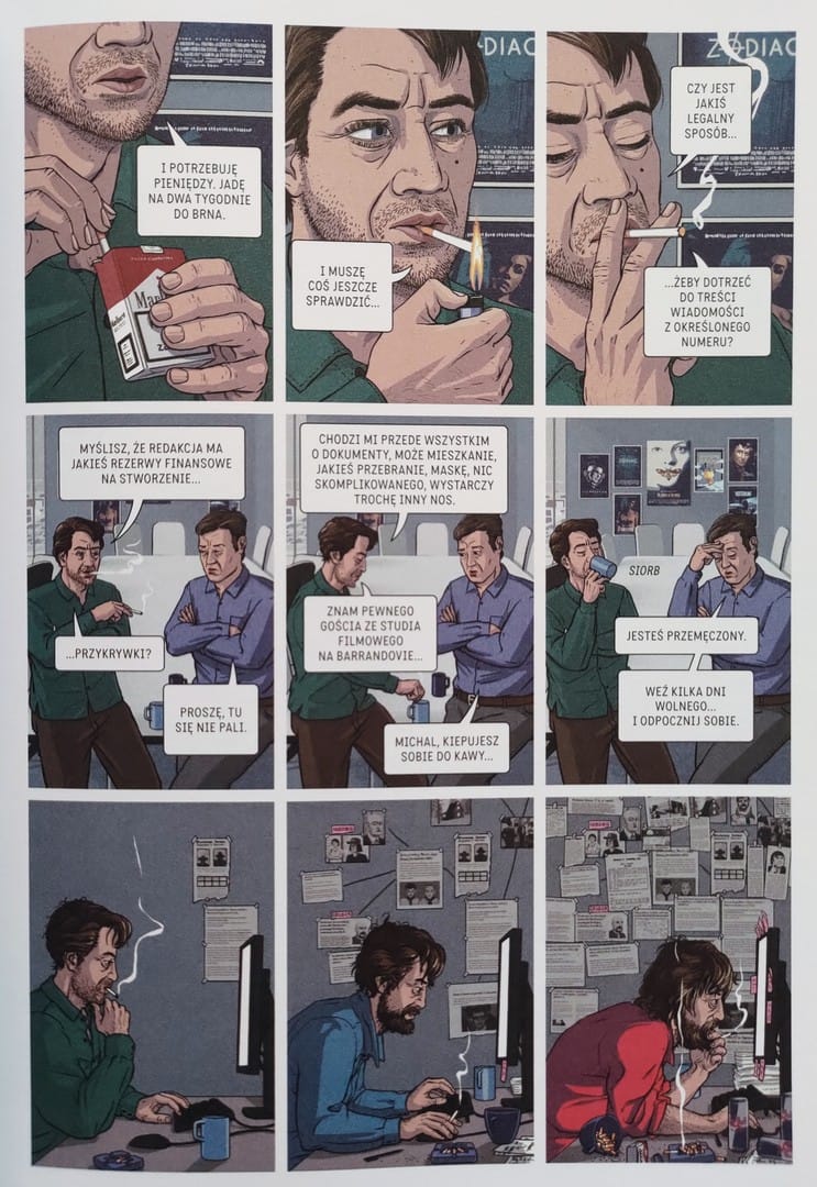 Rysunki Marka Pokorný’ego są idealnym dopełnieniem tej opowieści. Styl graficzny jest dosyć zróżnicowany, odpowiednio dobierany do omawianego wątku. Mamy tu zarówno bardziej szczegółową i urealnioną kreskę jak i bardzo mocno uproszczone graficznie rysunki. Podobnie z kolorami – od bardzo żywych po sepię. Artysta czerpie z tradycji europejskiego komiksu noir, ale dodaje własny twist: elementy surrealizmu, jak zniekształcone twarze czy nakładające się obrazy, które potęgują sensację.