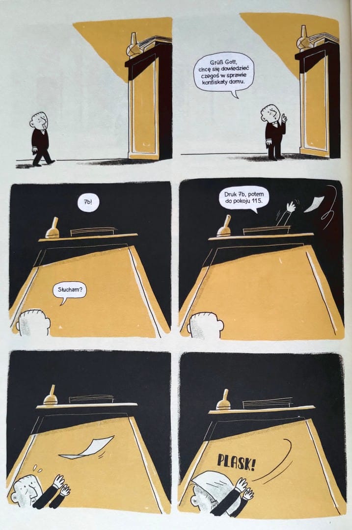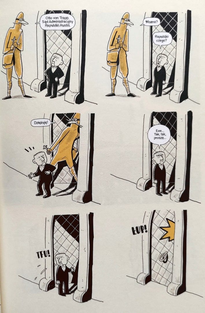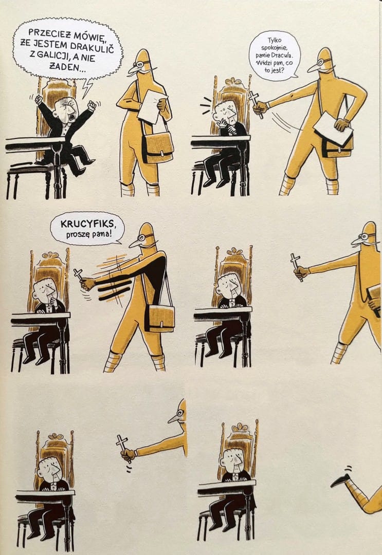 Fabuła opowieści jest absurdalnie prosta, a jednocześnie boleśnie prawdziwa. Akcja toczy się w 1921 roku. Vaclav, starszy pan mikrej postury, o niepokojącym nazwisku i bladoszarej cerze, zostaje wplątany w koszmar, który zna każdy dorosły człowiek w Polsce. Do rezydencji Drakulicia przyjeżdża urzędnik, który wręcza biednemu właścicielowi decyzję odbierającą mu zamek Drakuli. Biedny Vaclav rusza więc do Wiednia, by odwołać się od krzywdzącego aktu administracyjnego i odzyskać swoją posiadłość. Całość brzmi jak dramat społeczny, ale spokojnie — to jest komiks, w którym Kafka spotyka Bareję i piją razem herbatę z termosu w dworcowej poczekalni.