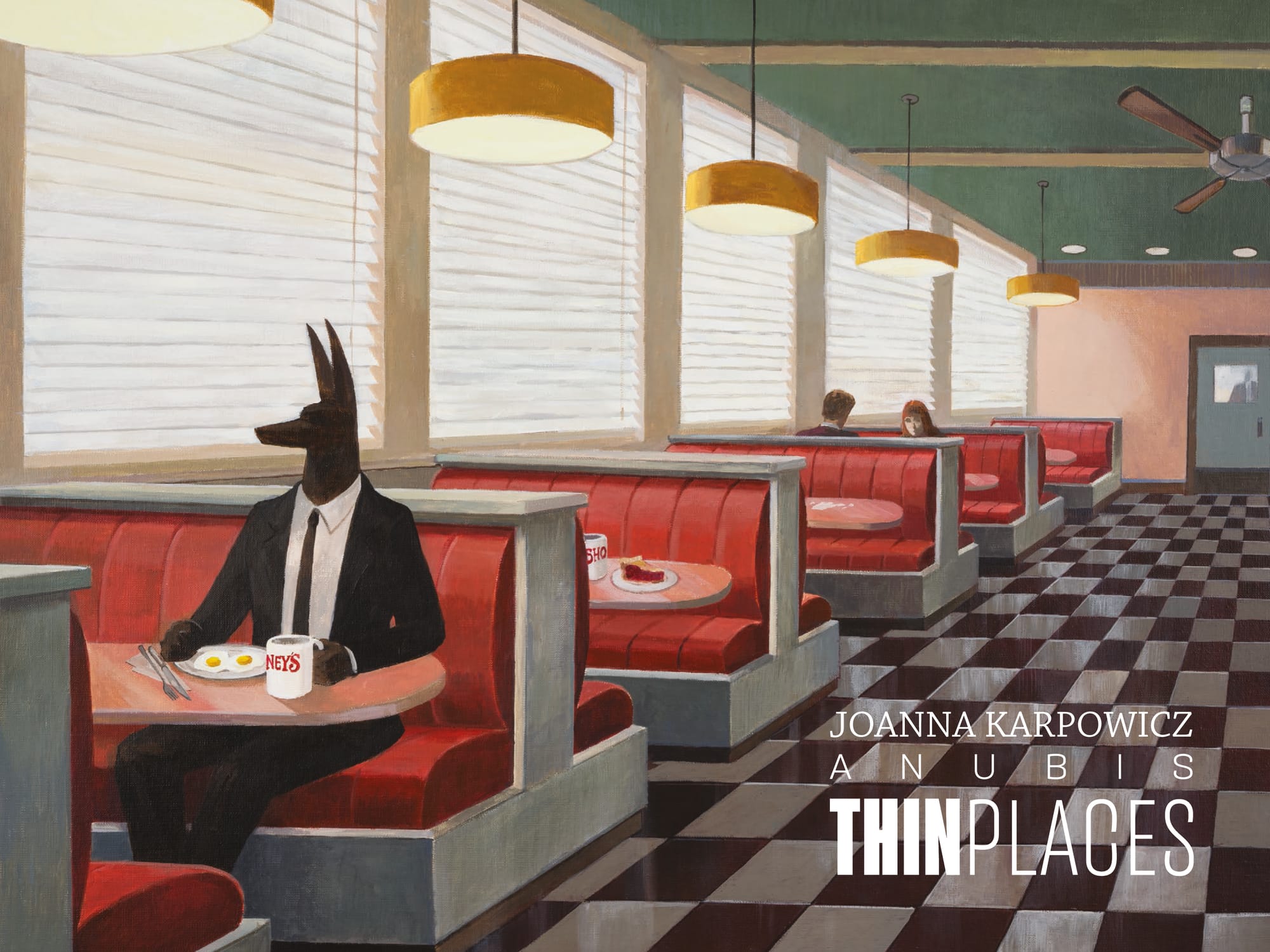 Joanna Karpowicz rozpoczęła swój malarski cykl z Anubisem w roku 2011. Egipskie bóstwo o głowie szakala, psychopomp o rodowodzie starożytnym pojawia się na płótnach Karpowicz w kontekstach współczesnych. Postać Anubisa nie jest personifikacją śmierci. Jest przewodnikiem dusz, „akuszerem odchodzących”, w ujęciu Jungowskim: „End of Life Doula”. Jest tym, który towarzyszy nam w przejściu między jednym światem a drugim. Spotykamy go na końcu swojej drogi, ale dostrzec możemy w ciągu całego życia - w miejscach gdzie granica, pomiędzy dwoma światami jest szczególnie cienka - w “Thin Places”.